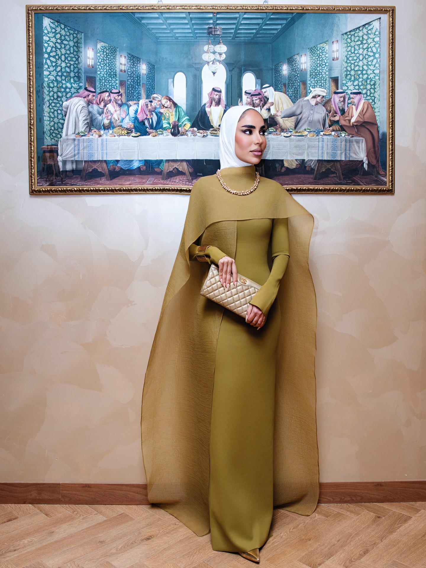 فستان ذهبي فاتح مع عباءة زيتونية مائلة إلى الذهبي صنع ثنائياً متناغماً. القماش اللامع منح الإطلالة وهجاً مسائياً، بينما جاءت المجوهرات الذهبية بتفاصيل بسيطة تحافظ على الرقي دون إفراط.