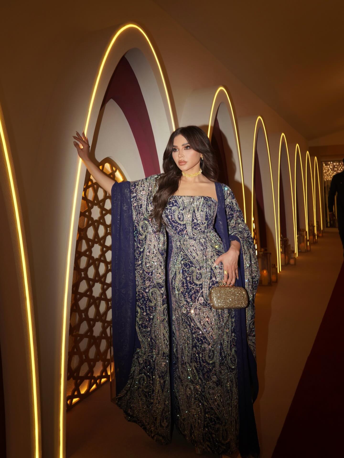 قفطان فاخر من Cattleya Fashion حمل توقيع الفخامة الشرقية. تدرجات الأزرق والبنفسجي تداخلت مع لمسات معدنية عاكسة للضوء، بينما أضفت الأكمام الواسعة طابعاً درامياً محبباً. حقيبة ذهبية صغيرة أنهت المشهد بأناقة تناسب أمسيات رمضان الراقية.
