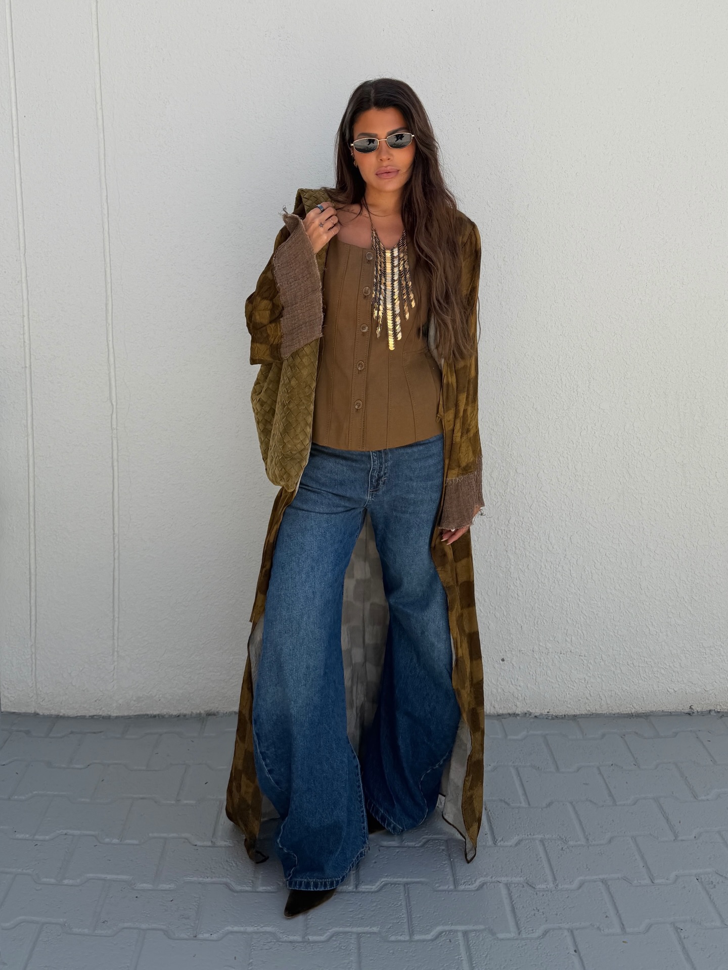 إطلالة مختلفة تميل إلى الطابع العملي؛ جينز واسع مع توب بلون ترابي، ومعطف طويل بتدرجات الزيتوني والبني. الإكسسوارات الذهبية والنظارات الصغيرة أضافت جرأة مدروسة، لتؤكد أن رمضان لا يمنع الأسلوب العصري… بل يهذّبه.