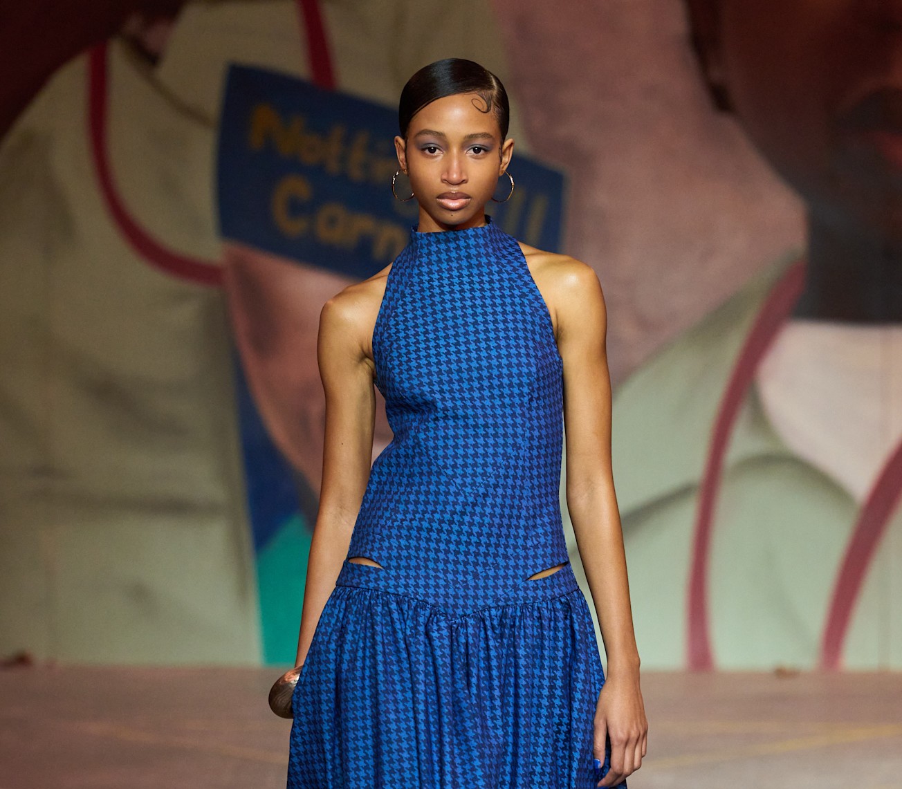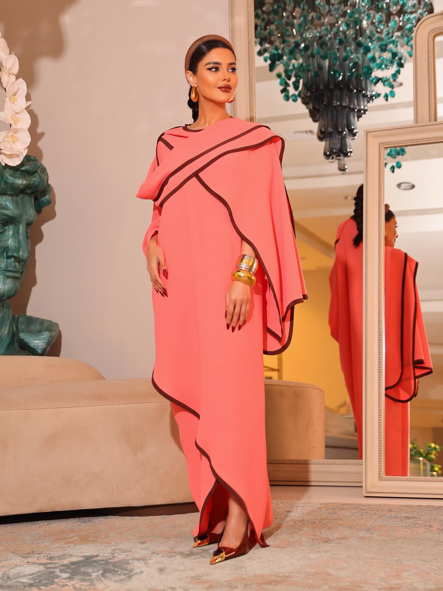 اختارت مرمر تصميماً غير متماثل بالوردي المرجاني من Harith Hashim، بخطوط داكنة تحدد الأطراف بأسلوب هندسي أنيق. الأساور العريضة والأقراط البارزة عززت الفخامة، والحذاء الذهبي المعدني عكس الضوء برقي.