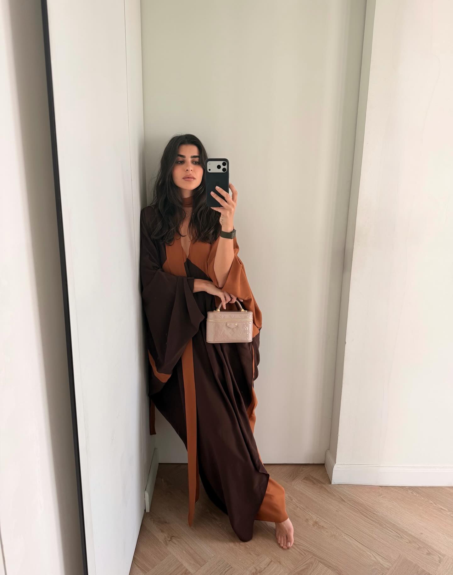 بعباءة من توقيع Harith Hashim جمعت بين البني الداكن والنحاسي، قدمت ديما مزيجاً متناغماً يعكس دفء الشرق. الأكمام الواسعة أضفت انسيابية أنثوية، والحقيبة البيج منحت الألوان الغنية استراحة بصرية أنيقة.