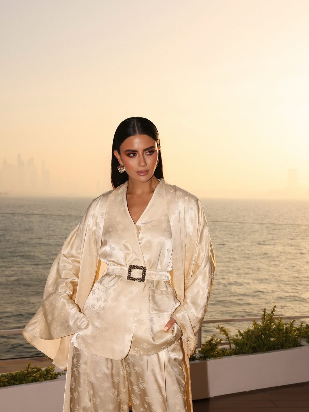 الإطلالة أكملت بحزام ناعم وحقيبة سوداء أيقونية، مع شعر منسدل ومكياج ترابي ناعم، ليبرز هدوء وراحة الإطلالة الرمضانية.
