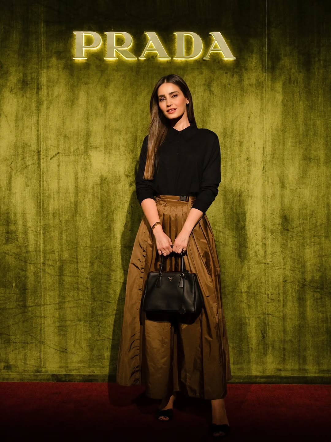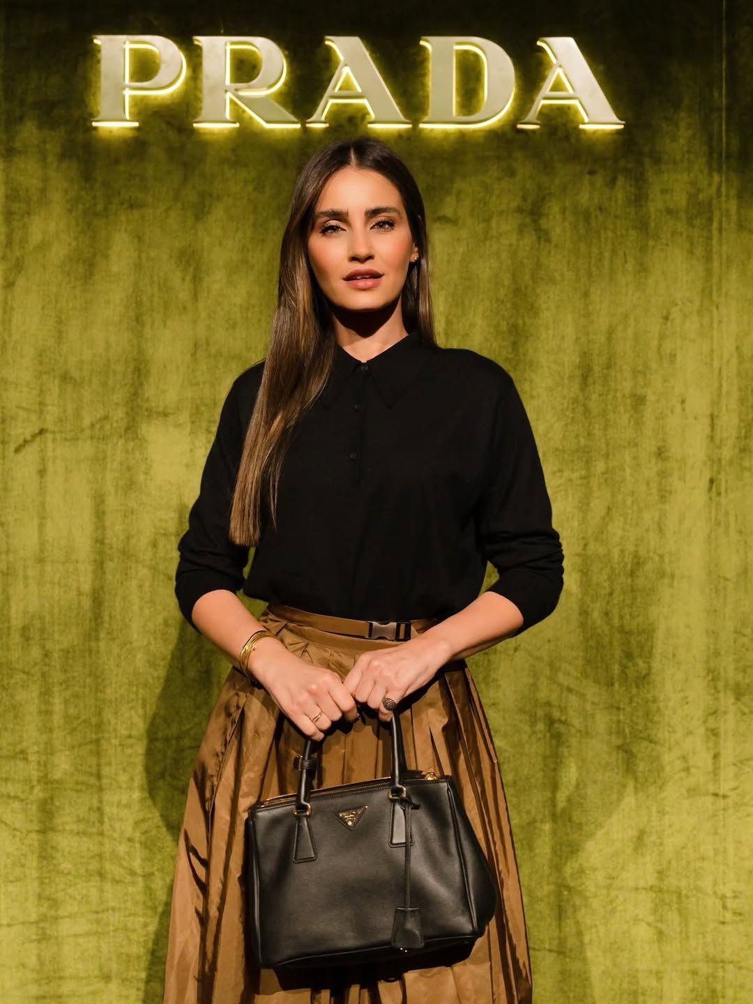 في حفل سحور Prada، ارتدت تنورة ماكسي برونزية لامعة مع كسرات عريضة، نسقتها مع قميص أسود كلاسيكي بأكمام طويلة وياقة مغلقة.