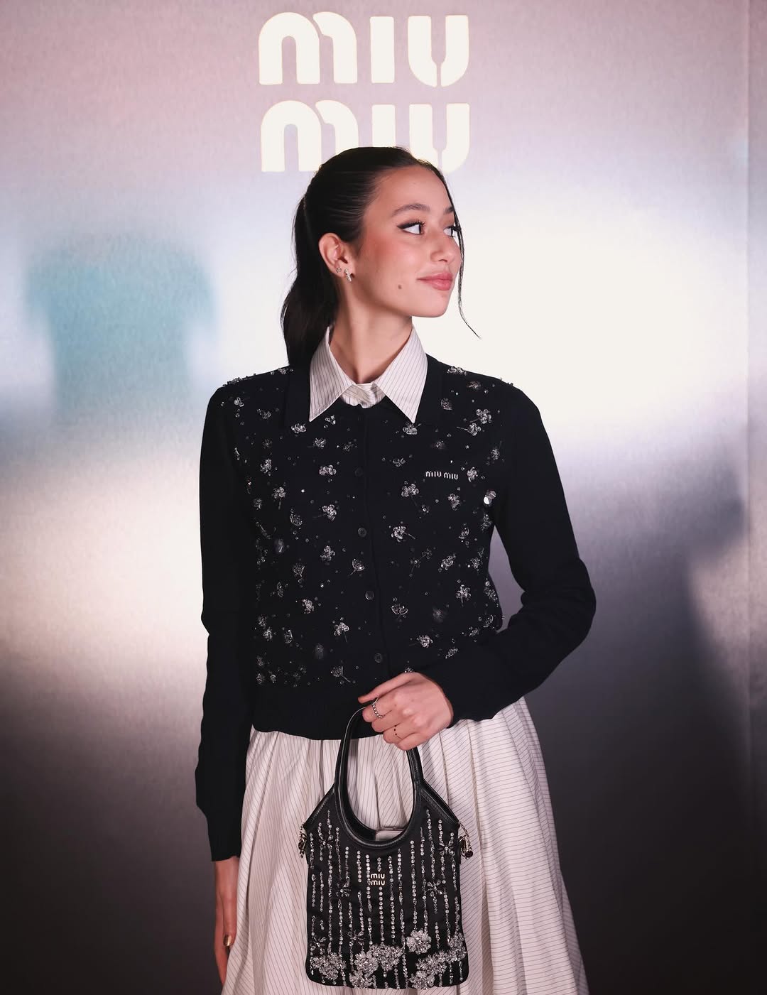 أكملت المظهر حقيبة صغيرة مزينة بالكريستالات وتسريحة ذيل حصان، مع مكياج ناعم يبرز نضارة البشرة.
