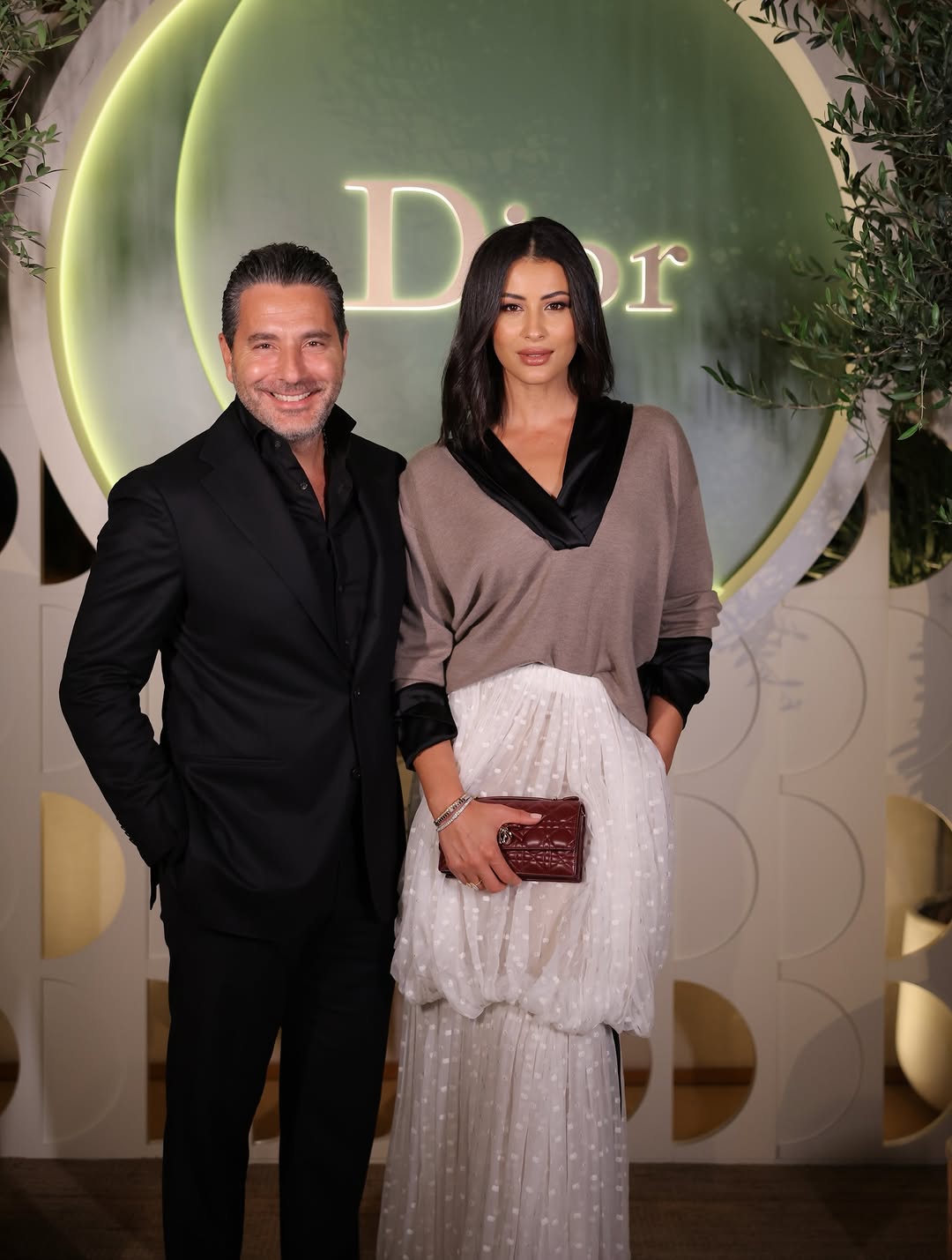 أكملت الإطلالة حقيبة "كلاتش" برغندي وحذاء أسود كلاسيكي، مع شعر منسدل ولمسات مكياج ناعمة من Dior Beauty.