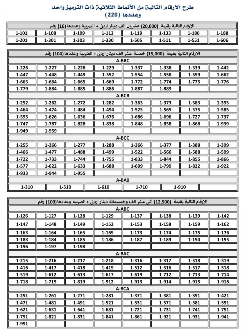 للعلّم - أعلنت إدارة ترخيص السائقين والمركبات عن طرح أرقام ثلاثية مميزة من ترميز /1 للبيع المباشر عبر بوابتها الإلكترونية.