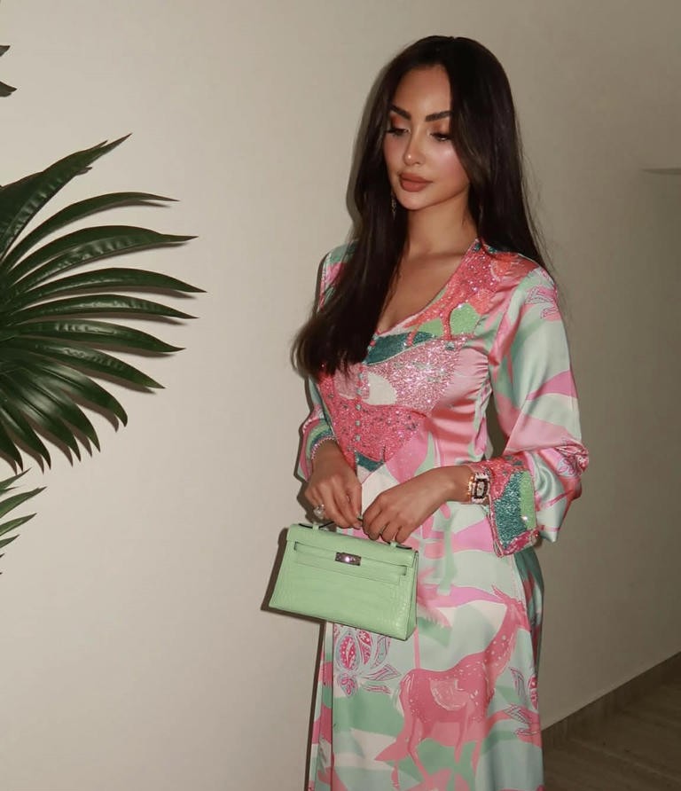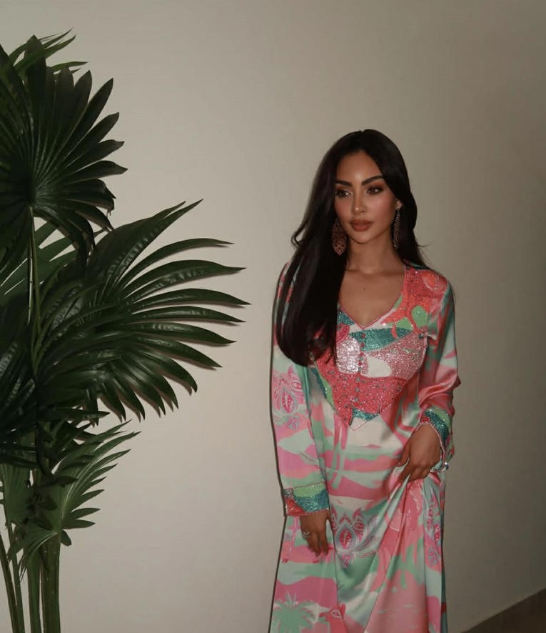 اعتمدت الغندور في إطلالتها على فخامة قماش الحرير، الذي أضفى انسيابية ساحرة على قوامها، معززاً بطبعات ورسوم ملونة بتدرجات الوردي والباستيل الرقيقة. وما زاد من خصوصية هذا "المخور" هو التطريز الدقيق بالترتر الملون واللامع الذي تركز عند منطقة الصدر وأطراف الأكمام، مما منح الزي لمسة من البريق الذي يناسب السهرات الرمضانية الفخمة، ويوازن بين الحشمة الكلاسيكية والجاذبية العصرية.