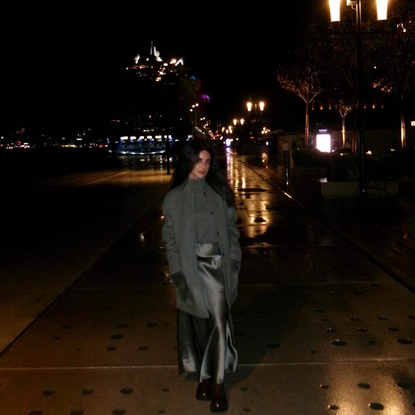 نجمة مسلسل شارع الأعشى لمى عبد الوهاب اختارت أسلوب الـMonochrome بدرجات الرمادي في إطلالة شتوية أنيقة، حيث نسقت تنورة ساتان لامعة مع كنزة بياقة مرتفعة ومعطف صوفي طويل باللون ذاته. كسرَت رتابة الرمادي بحذاء عنابي ضخم أضفى بعدًا عصريًا جريئًا.