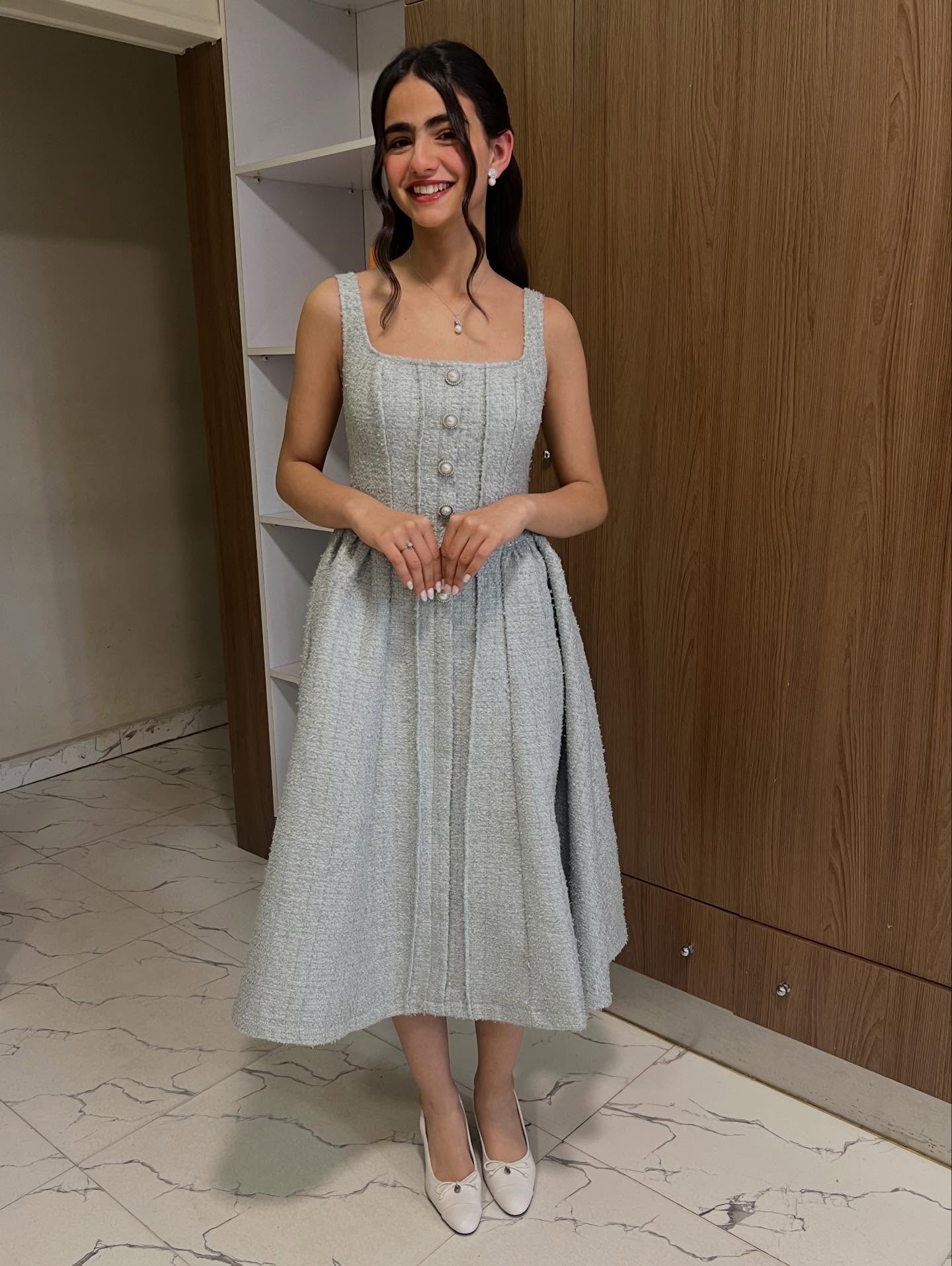 وفي ظهور آخر، اختارت فستانًا من التويد الأزرق السماوي من علامة femi9، بقصة كورسيه وأزرار لؤلؤية وتنورة واسعة، فبدت الإطلالة أقرب إلى أناقة باريسية بنكهة عصرية.