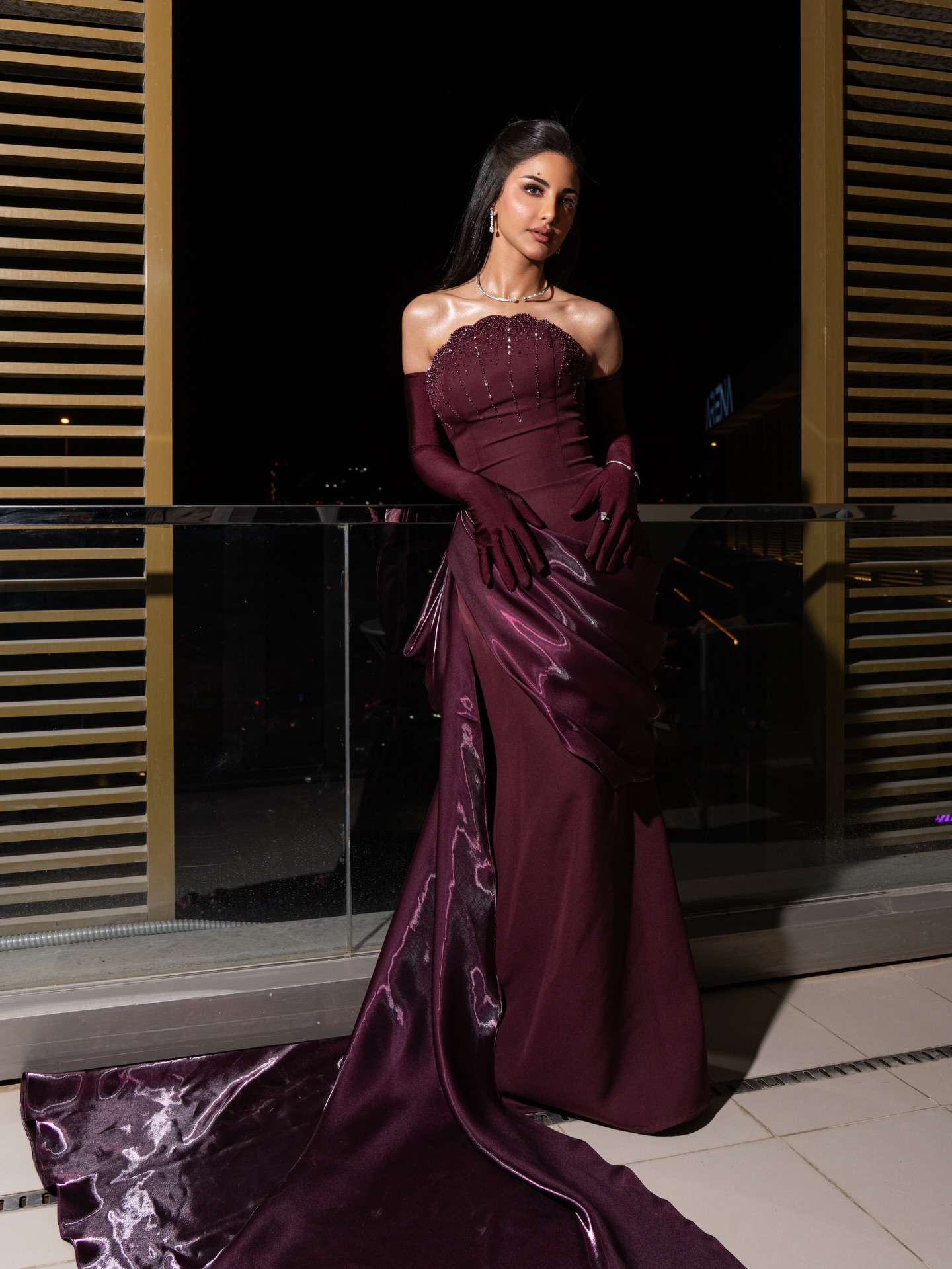 وفي إطلالة سهرة، تألقت بفستان برغندي داكن بتصميم أوف شولدر وصدر مرصع بتطريزات براقة، مع فتحة جانبية وذيل ساتان طويل منحها حضورًا دراميًا متكاملًا، خاصة مع القفازات الطويلة والقلادة الألماسية الرقيقة.
