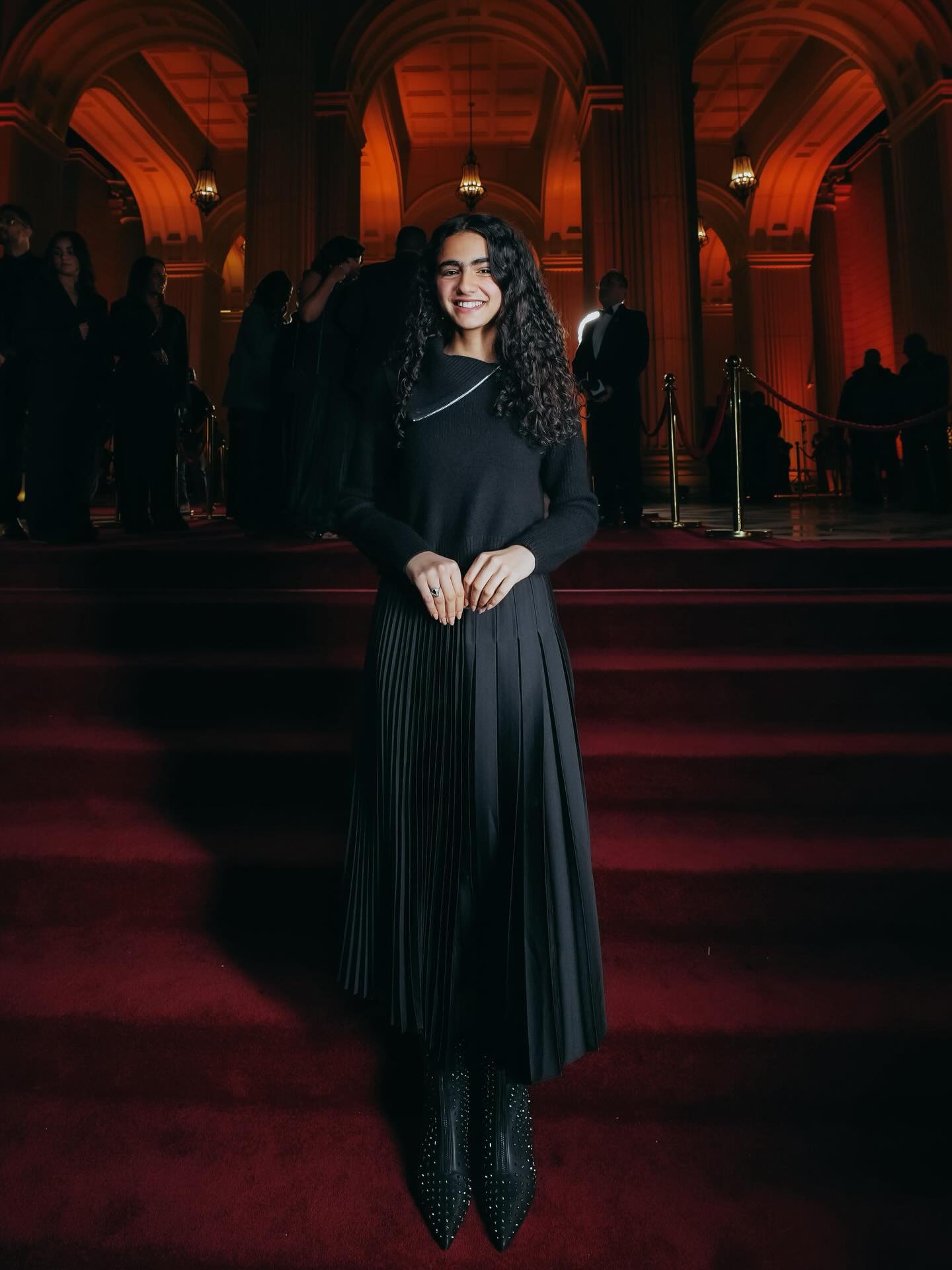 نجمة مسلسلي فخر الدلتا و*صحاب الأرض*، تارا عبود، اختارت فستانًا أحمر ملكيًا من توقيع المصممة Nafsika Skourti، بصدر كورسيه مخملي وتنورة ضخمة بكسرات عريضة، نسقته مع حذاء مدبب بنفس اللون وحقيبة سوداء مرصعة، فبدت وكأنها خرجت من مشهد ختامي في فيلم ملحمي.