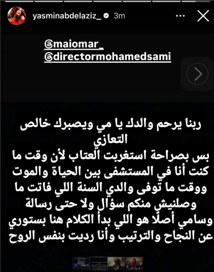 تلك الكلمات لم تعجب ياسمين عبد العزيز، التي قررت أن ترد عبر خاصية القصص المصورة قائلة "ربنا يرحم والدك يا مي ويصبرك خالص التعازي.. بس بصراحة استغربت العتاب لأن وقت ما كنت أنا في المستشفى بين الحياة والموت ووقت ما توفى والدي السنة اللي فاتت ما وصلنيش منكم سؤال ولا حتى رسالة".