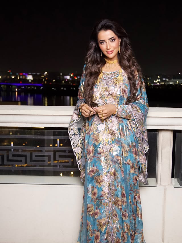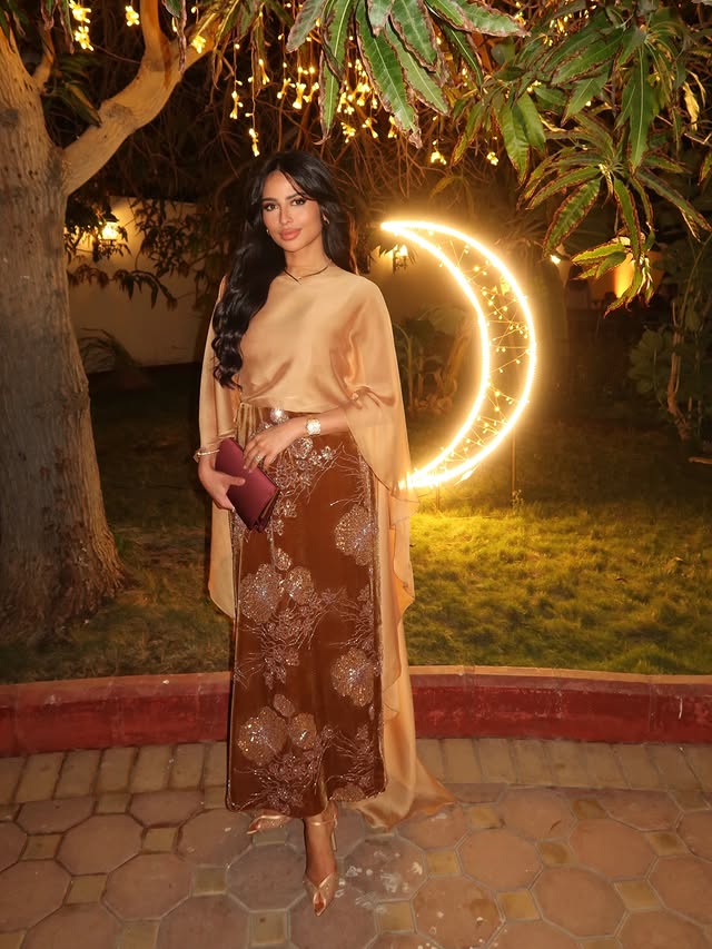 بإطلالة عصرية خارجة عن المألوف تألقت المؤثرة لما العقيل بقفطان أنيق وفخم بمزيج ما بين قماش القطيفة المطرز باللون البني والشيفون الذهبي الذي انسدل بإنسيابية على الأكتاف والظهر.