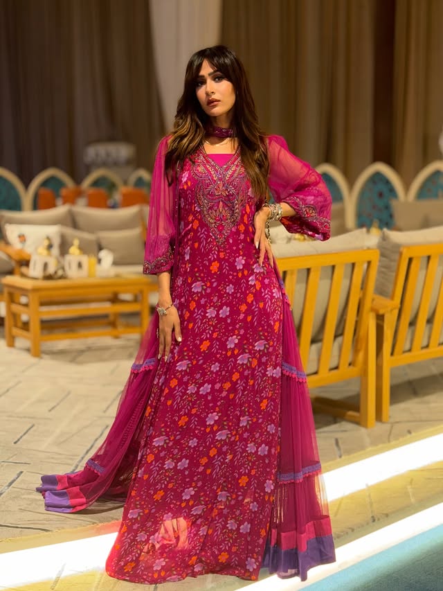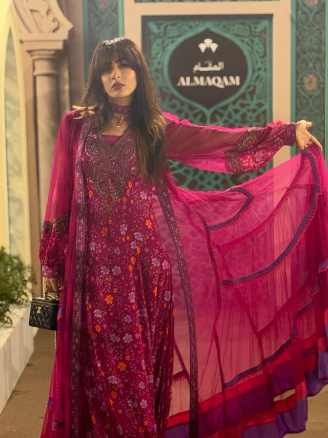بأسلوبها الراقي والمدروس أطلت عارضة الأزياء والمؤثرة رهف الحربي بعدد من الإطلالات المميزة خلال ليالي الشهر الفضيل، وكانت من أكثر إطلالاتها فخامةً إطلالتها بفستان من القطيفة البنفسجي مع أكمام منفصلة مطرزة باللون الذهبي اللامع على شكل ورود.