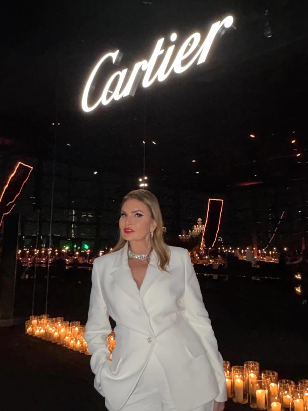 ونسقت الإطلالة بأسلوب مونوكروم مع حقيبة كريستالية من Alexander McQueen وصندل مرصع، مكتفية بأقراط ماسية طويلة.