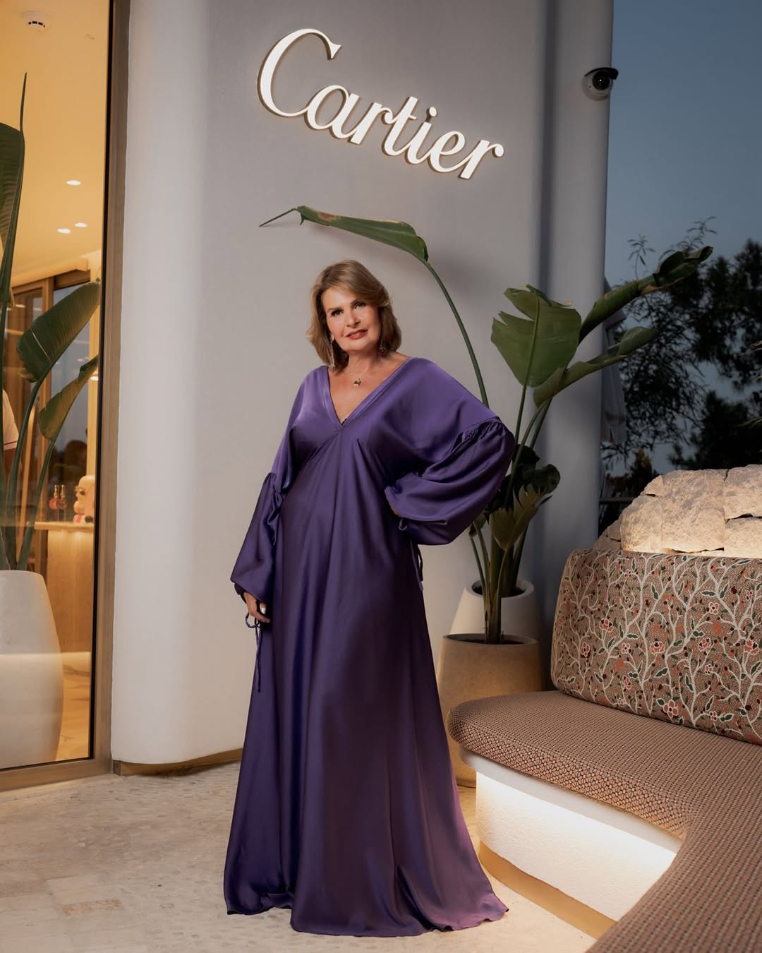 ومن الإطلالات الراقية أيضًا فستان حريري طويل باللون البنفسجي الداكن، جاء بقصة انسيابية مع فتحة ياقة على شكل V وأكمام واسعة منتفخة مزينة بأربطة عند المعصمين.
