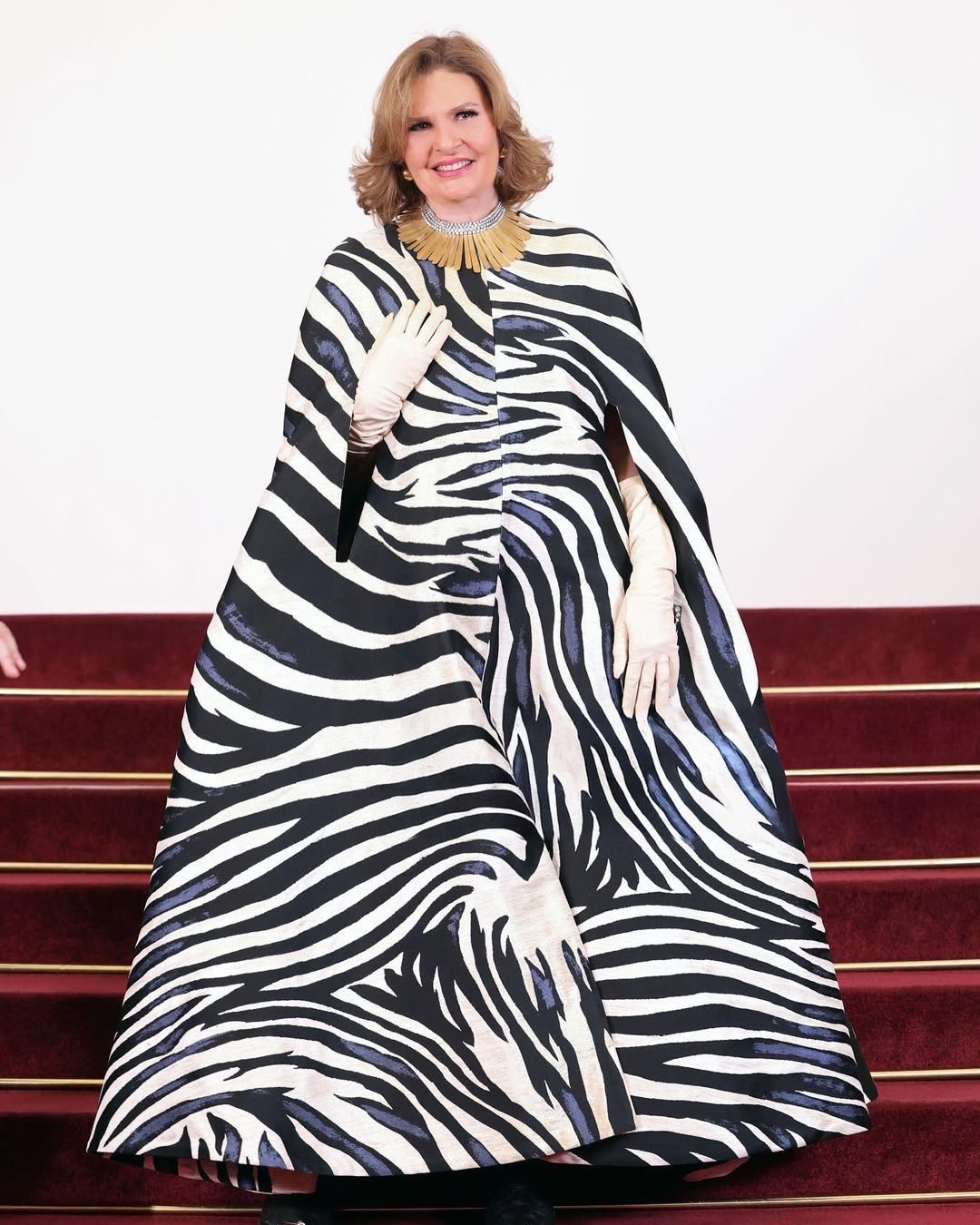 اعتمدت يسرا أيضًا إطلالة لافتة بطبعة الزيبرا من تصميم Stephane Rolland، حيث ارتدت ثوبًا فضفاضًا باللون الأبيض مزينًا بخطوط سوداء.