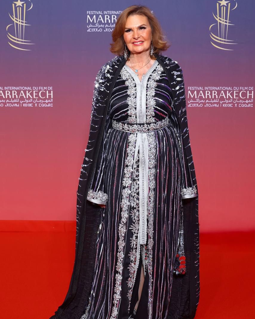 في ظهور آخر على السجادة الحمراء في مهرجان مراكش السينمائي الدولي، اختارت يسرا القفطان المغربي بتصميم داكن من توقيع Maison Fatim.