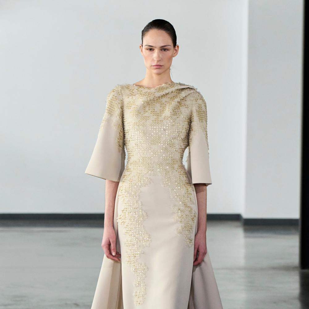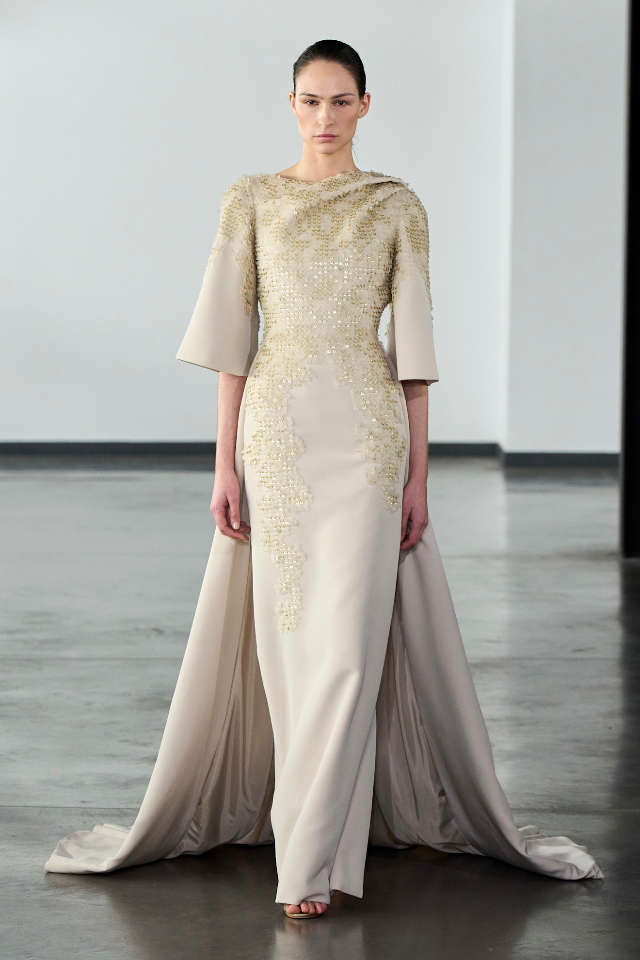 من التصاميم اللافتة أيضاً الفساتين المطرزة برسومات هندسية ولمسات براقة، مثل التصميم الذي قدمته دار Rami Al Ali. يتميز الفستان بقماش بيج مطبع بدوائر ذهبية مع حبيبات باييت لامعة تمنحه بريقاً أنيقاً.