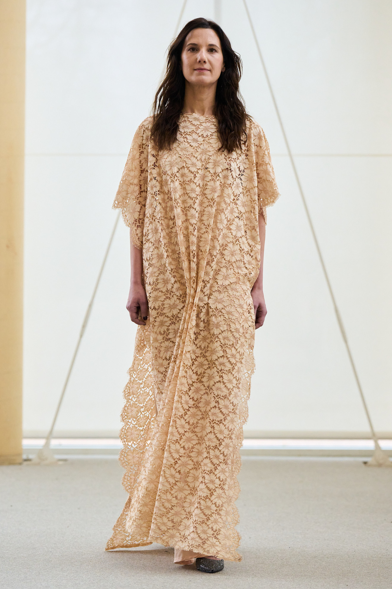 لإطلالة تجمع بين الأسلوب الشرقي والأناقة العصرية، يمكن اختيار القفاطين البيج المزينة بالنقشات المفرغة. وتقدم دار Aelis تصميماً طويلاً وفضفاضاً يبرز بجماله من خلال زخارف دانتيل مترابطة على كامل الفستان.