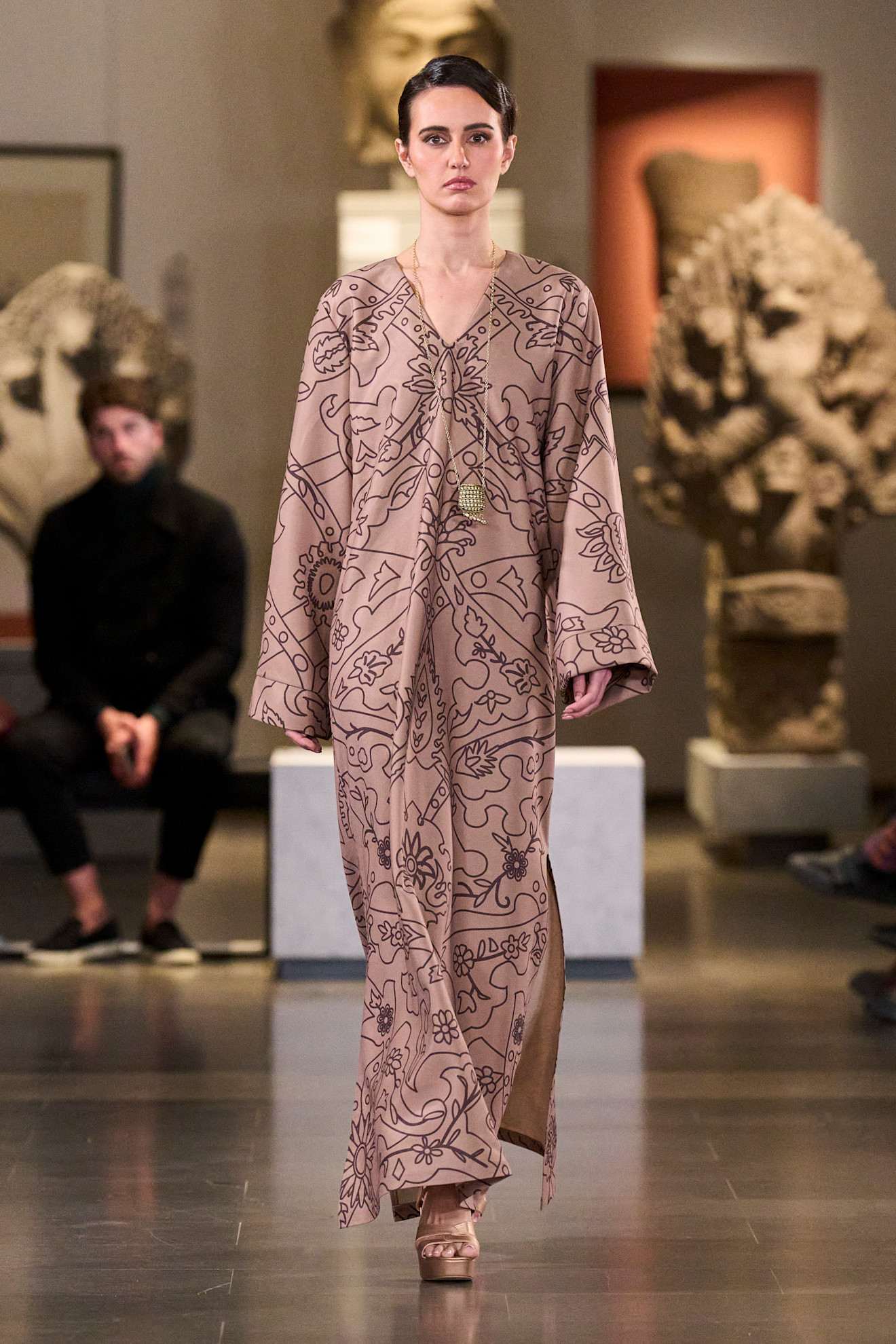 ويصل التصميم إلى الكاحل بقصة مريحة لا تحدد القوام، مع ياقة منخفضة وأكمام نصفية واسعة بأسلوب الكلوش، ما يجعله خياراً مثالياً لإطلالة تجمع بين الفخامة والراحة.