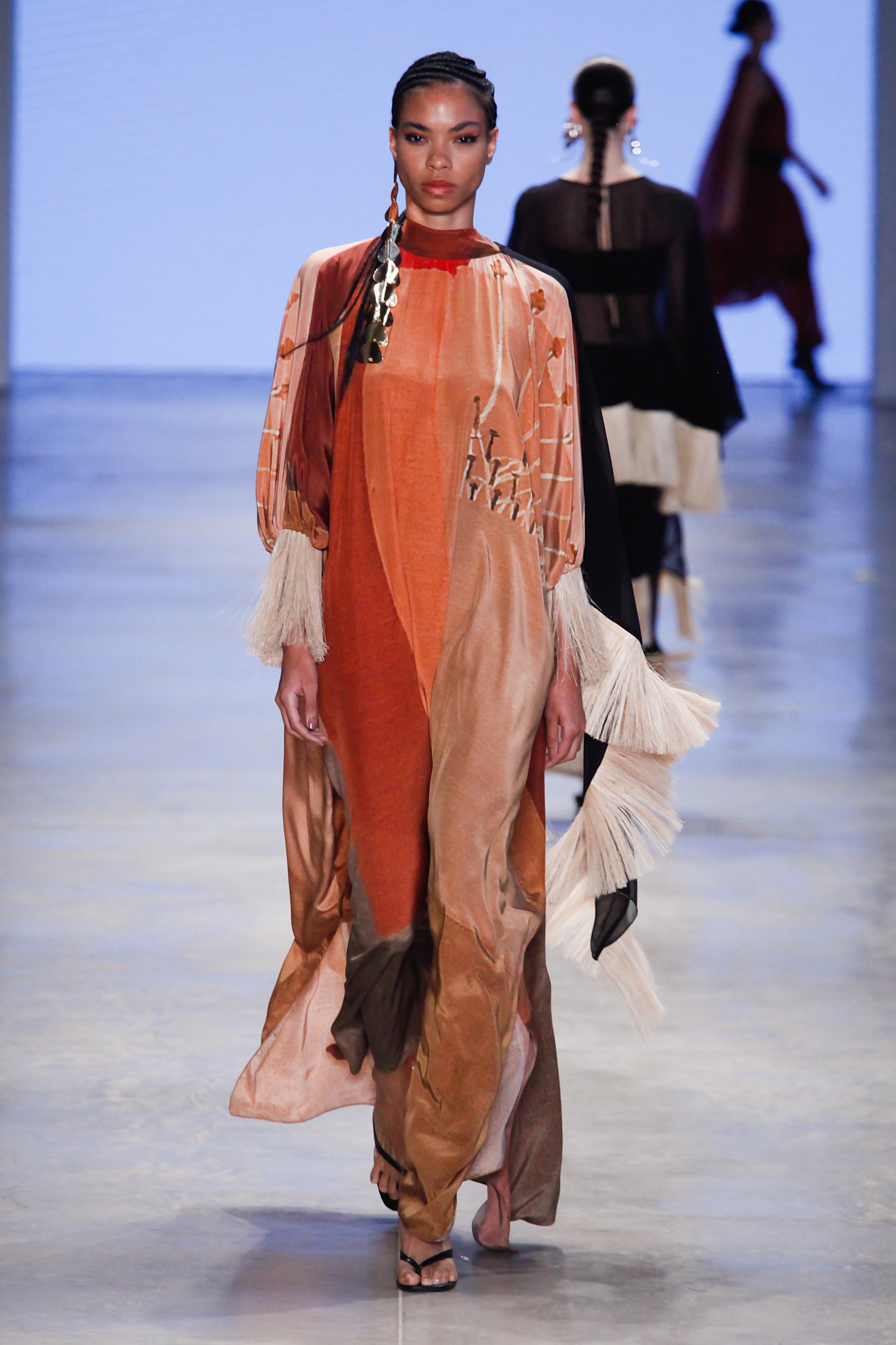 القفطان يبقى من القطع الأساسية في إطلالات العيد، خصوصاً عندما يأتي بقصات واسعة مستوحاة من أناقة التسعينيات. وتقدم دار Zakirli قفطاناً ماكسياً بتدرجات اللون الزهري مزيناً بزخرفات هندسية متدرجة على كامل التصميم.