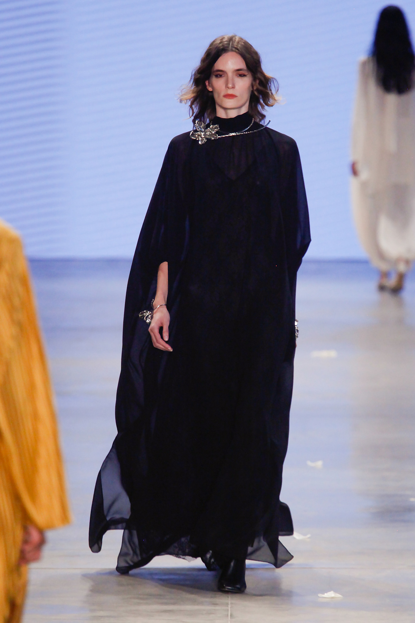 اللون الأسود لا يغيب عن إطلالات العيد، خاصة عندما يأتي بأسلوب عصري وملفت. وقدمت دار Marina Bitu فستاناً طويلاً لامعاً بقصة متدرجة فضفاضة، تزينه ثنيات قماش عريضة وتفاصيل من التول.