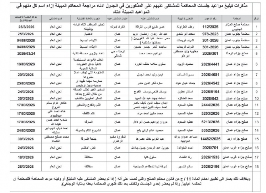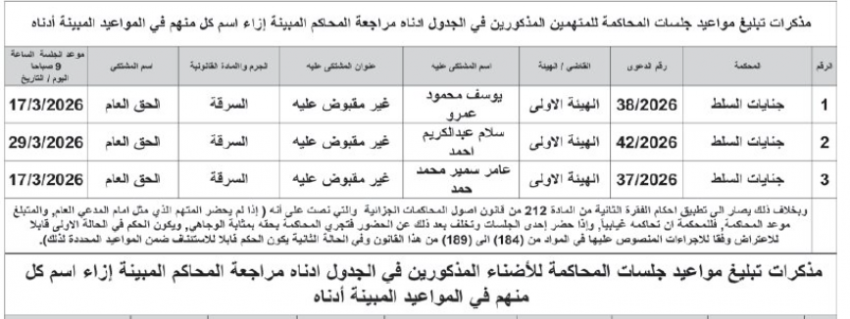 للعلّم - أصدرت محاكم عدة اليوم الإثنين، مذكرات تبليغ بمواعيد جلسات المحاكمة لمشتكى عليهم.