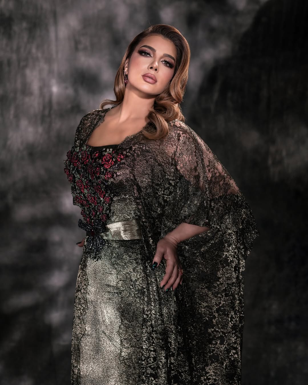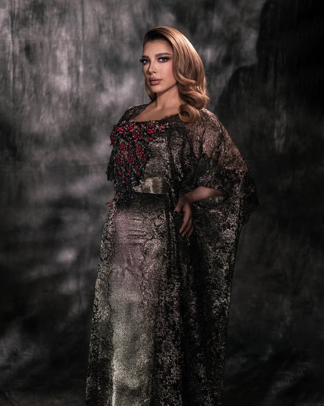 قدّمت إطلالة شرقية مميزة بتدرجات رمادية معدنية داكنة من توقيع HOUIDA ALBARIDI، بتصميم يشبه العباءة مع كاب دانتيل فاخر.