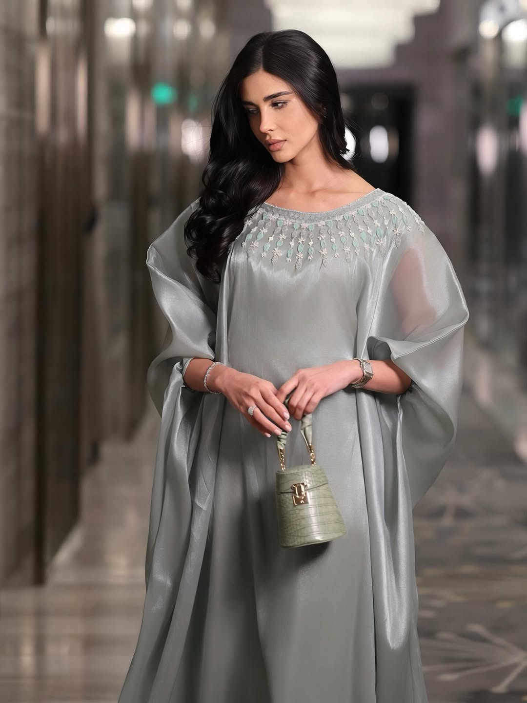 لفتت الأنظار بإطلالة راقية من توقيع AL HASNA SIGNATURE، جاءت بأسلوب قفطان عصري بتدرجات رمادية لامعة. تميز التصميم بأكمام أورغانزا منفوخة وكورسيه مطرز يحدد الخصر، مع تنورة واسعة تعكس فخامة القماش.