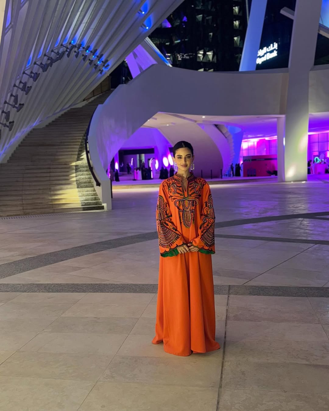 ففي إحدى مناسبات السحور، ارتدت عباية طويلة باللون البرتقالي القوي، جاءت بقصة واسعة تخفي ملامح القوام، مع أكمام واسعة وياقة عالية مفتوحة من الأمام، وتزينت بتطريزات شرقية كثيفة عند الصدر والذراعين بخطوط حريرية بارزة وحبات كريستال منحتها بعدًا فخمًا. ونسقت مع الإطلالة أقراطًا مرصعة، وحقيبة يد سوداء، مع تسريحة كعكة عالية.