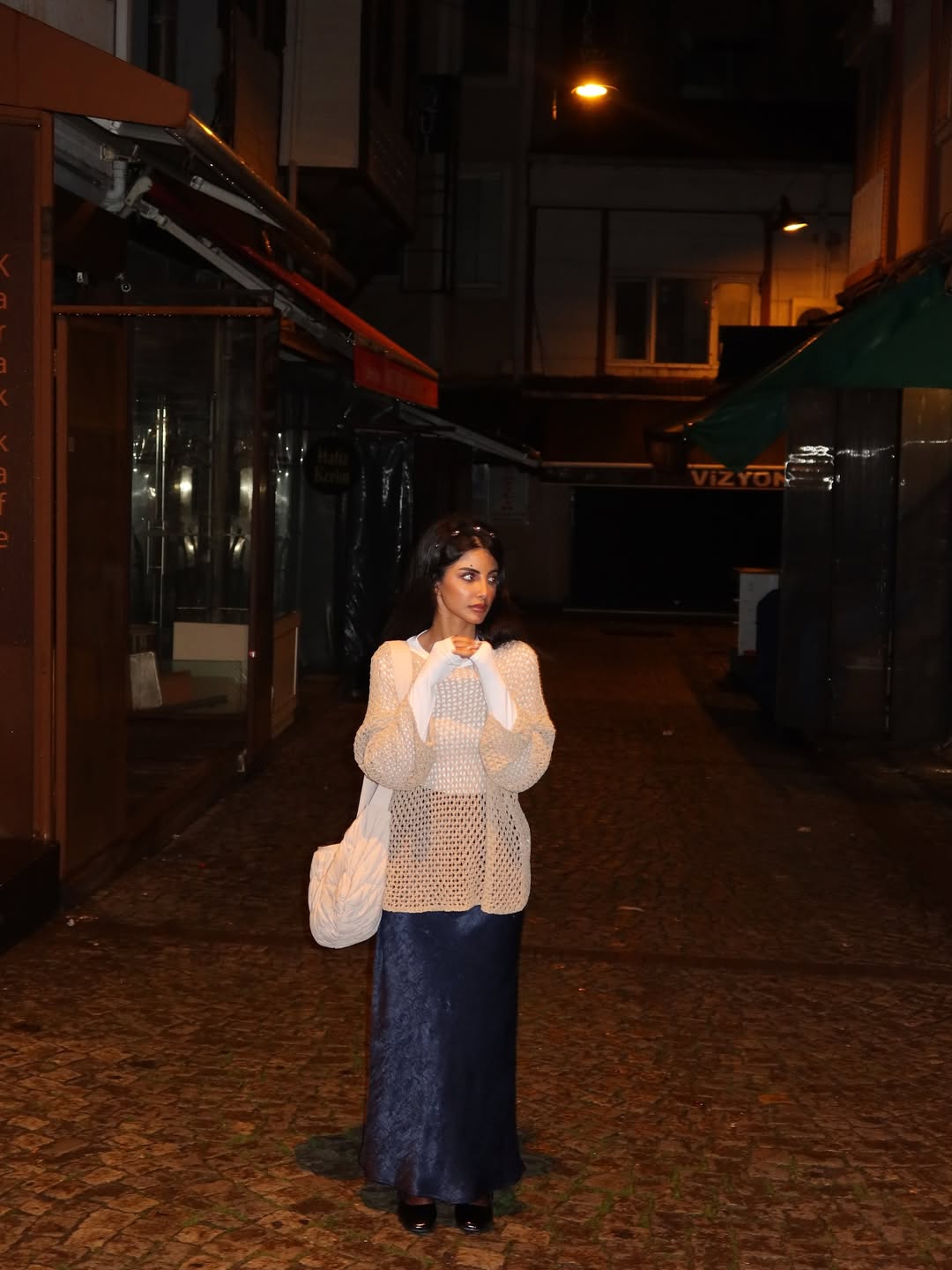 وفي إطلالة ليلية مريحة، اختارت تنورة ماكسي من المخمل باللون الأزرق الداكن، مع توب أبيض تعلوه بلوزة صوفية أوفر سايز باللون البيج، جاءت بتصميم محبوك وغرز مفتوحة أضفت على اللوك طابعًا دافئًا وعفويًا. وأكملت الإطلالة بحقيبة كتف كبيرة وحذاء باليرينا أسود، مع شعر منسدل بهدوء خلف ظهرها.