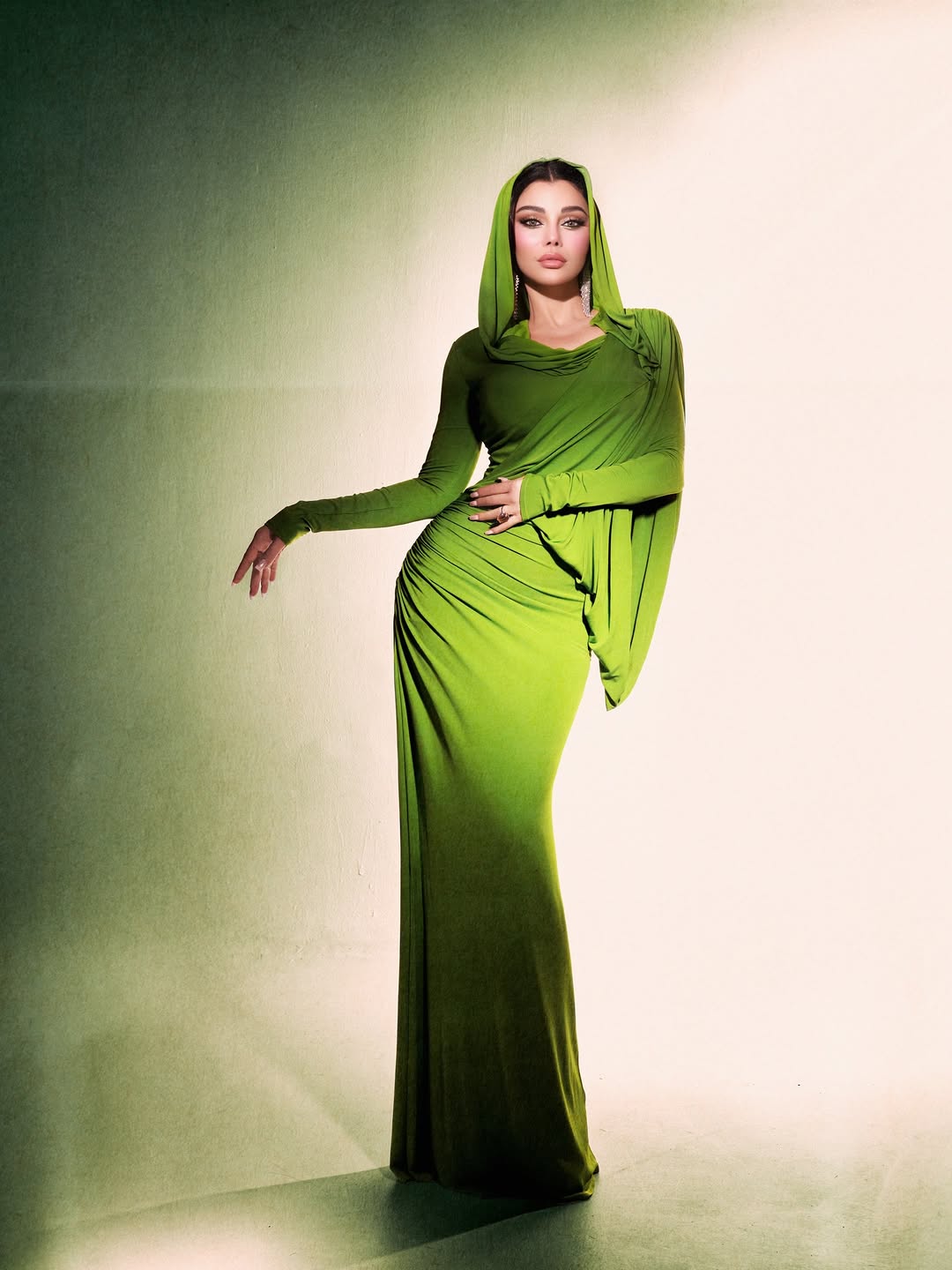 اختارت هيفاء فستانًا طويلًا باللون الأخضر الزمردي الغني، جاء بقصة ملاصقة للجسم وأكمام طويلة، وتميز بتصميم الهودي المتصل بياقة الفستان، ما منح الإطلالة طابعًا دراميًا أنيقًا. كما اعتمد التصميم على زمزمات ناعمة امتدت أفقيًا على كامل الفستان، فأبرزت القوام بأسلوب أنثوي وأضافت حركة جميلة إلى القماش الموحد. وأكملت هيفاء اللوك بأقراط ماسية طويلة زادت الإطلالة فخامة.