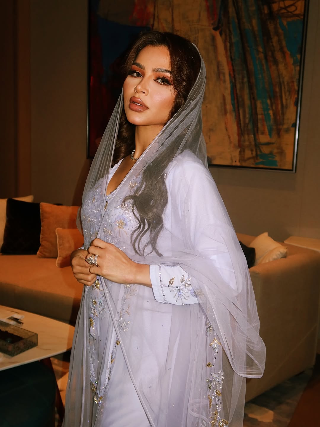 تميّزت القطعة العلوية بعباءة من الشيفون الشفاف، زينت بتطريزات يدوية دقيقة على شكل زهور برية ملونة، إلى جانب خيوط ذهبية وفضية توزعت على منطقة الصدر والأكمام والأطراف. وأضاف الوشاح المنسدل على الرأس بأسلوب التول لمسة تراثية بروح عصرية، فيما أكملت نهى إطلالتها بمجوهرات ماسية ناعمة وعقد تشوكر رقيق.