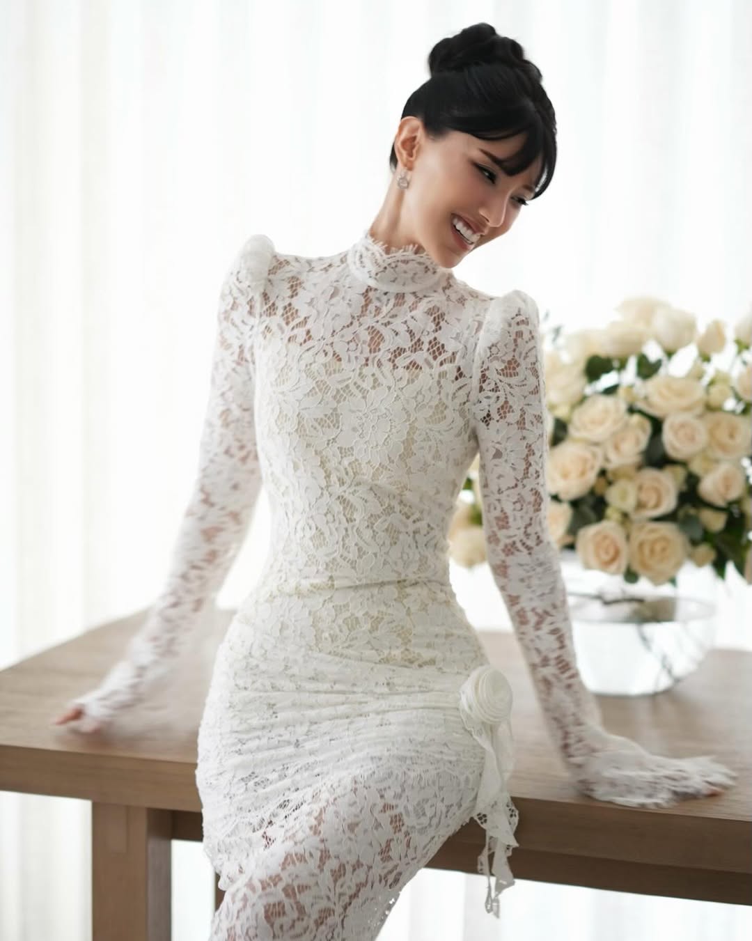 اختارت الممثلة السعودية زينب البلوشي الابتعاد عن الإطلالات التقليدية في العيد، وظهرت بفستان أبيض طويل بطابع عرائسي ناعم. جاء التصميم ملاصقًا للجسم ومصنوعًا بالكامل من الدانتيل الفاخر المشغول بنقوش زهرية دقيقة، مع ياقة عالية وأكمام طويلة.