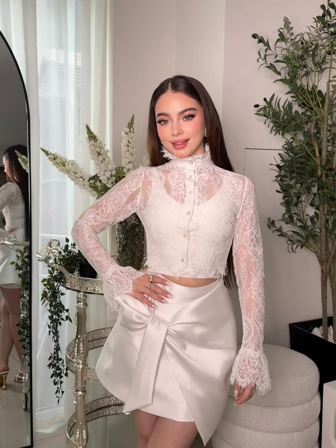 اختارت النجمة الشابة بيسان إسماعيل إطلالة أنيقة تمزج بين الأنوثة والجرأة، فظهرت في جلسة تصوير خاصة بمناسبة العيد مرتدية بلوزة من الدانتيل الأبيض بأكمام طويلة، نسقتها مع تنورة قصيرة من الساتان الأبيض زينتها تفاصيل أنثوية وزمزمات أمامية.