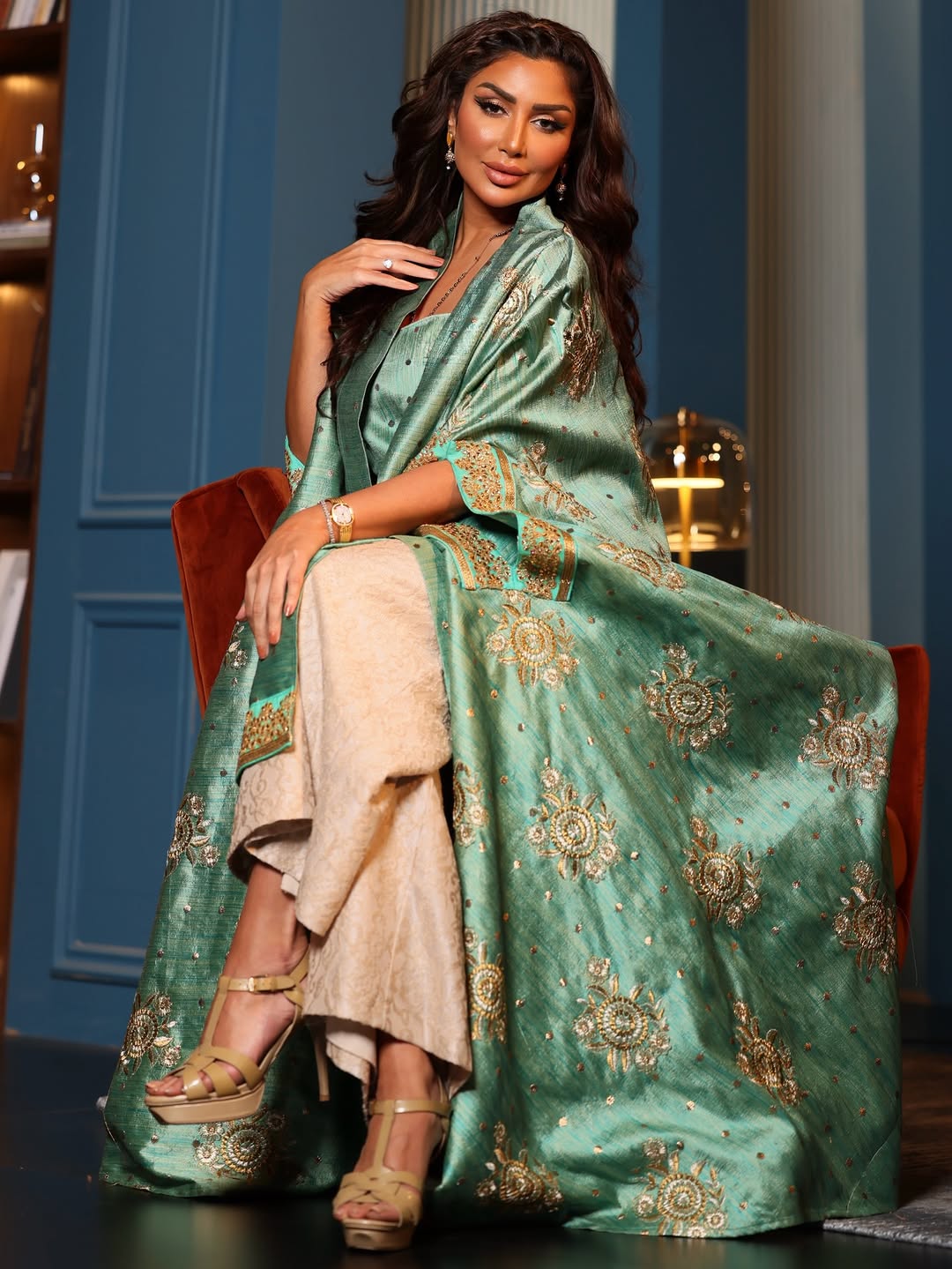 بدورها، أطلت هدى حمدان بإطلالة شرقية أنيقة عكست فخامة العيد، حيث اختارت تنسيقًا باللون الأخضر بتدرجاته الهادئة، جاء عبارة عن عباءة مطرزة بنقوش ذهبية غنية أضفت على التصميم طابعًا فخمًا.