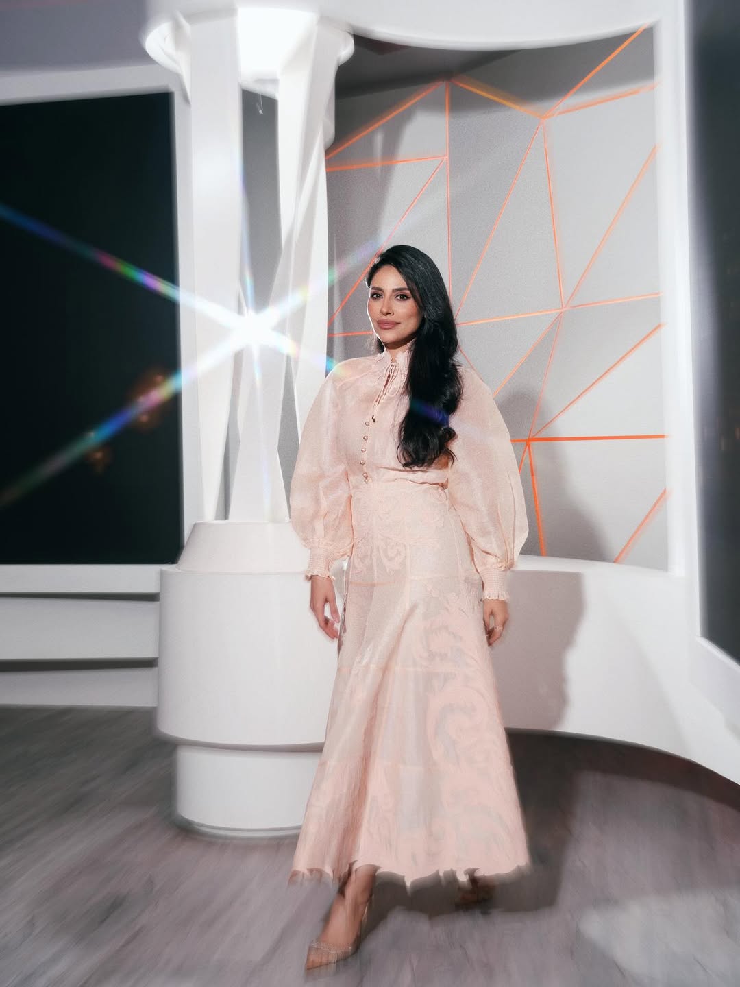 اختارت الإعلامية رؤى الصبان في أول أيام عيد الفطر إطلالة ربيعية أنثوية حملت أيضًا توقيع Zimmermann، وجاءت على شكل فستان طويل بأسلوب Maxi، صُمم من مزيج اللينين والحرير ومزين بنقشات زهور متداخلة بدرجات الأزرق السماوي والوردي الباهت على خلفية أوف وايت ناعمة.