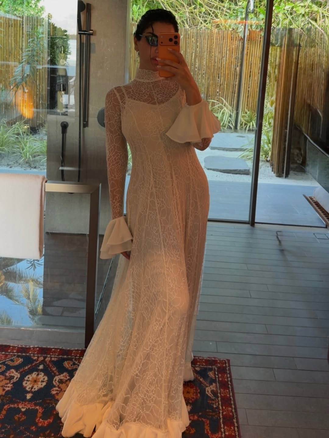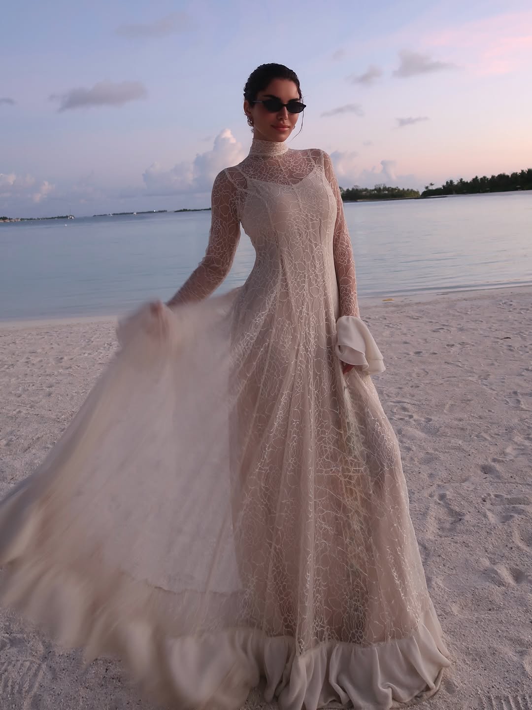 من أجواء المالديف، خطفت نجود الرميحي الأنظار بإطلالة تجمع بين الرقي والاسترخاء، حيث اختارت فستانًا طويلًا من الدانتيل الأبيض المفرغ من توقيع Alanoud Alsalem.