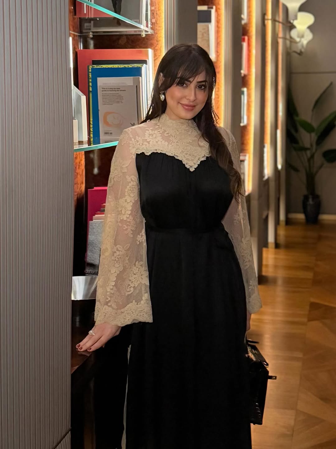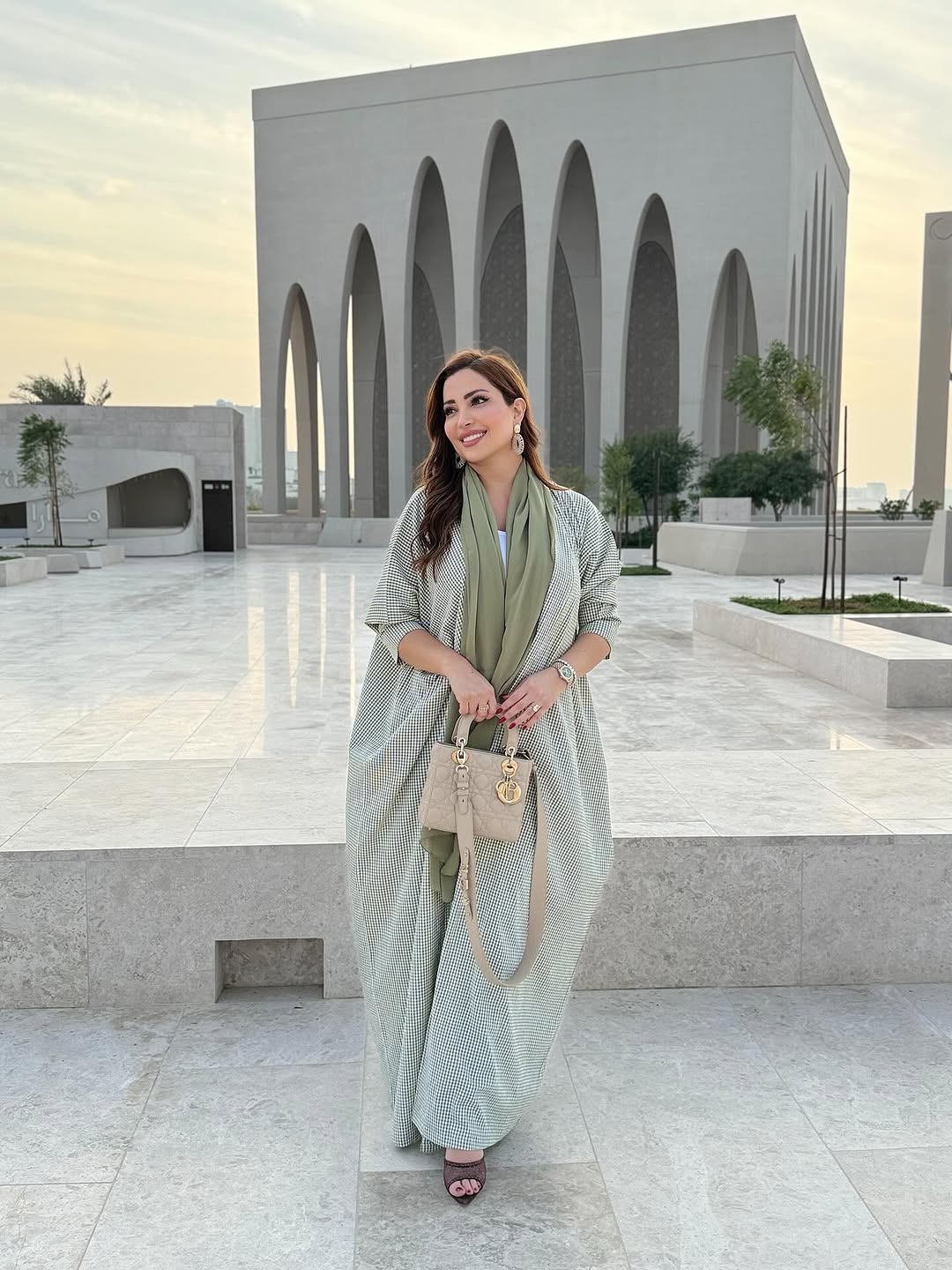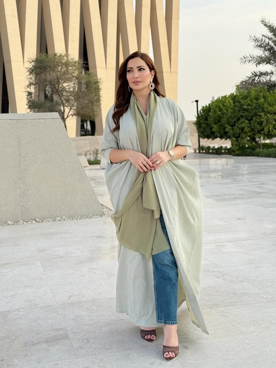 في إطلالة جمعت بين الحشمة والطابع العصري، تألقت نسرين طافش بتصميم من دار Sara Bostani Abaya، جاء على شكل عباءة مفتوحة بقماش قطني بارد ومريح، مزين بنقشة كاروهات صغيرة باللون الأخضر الزيتوني والأبيض الكريمي.