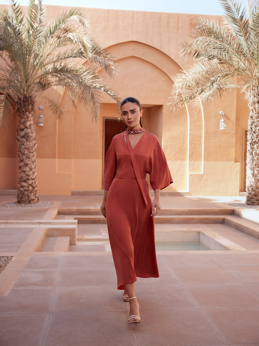 واتسم الفستان بقماش حريري لامع وانسيابي، مع تصميم علوي بأسلوب اللف شكل ياقة V Neck ناعمة، وأكمام كيمونو واسعة أضفت على الإطلالة حركة مميزة. أما العنصر الأبرز فكان حزام الرقبة الرفيع المرصع بالكريستال، والذي منح اللوك بريقًا أنيقًا يغني عن أي عقد ضخم. وأكملت ديما الإطلالة بتسريحة ذيل حصان مرتفعة، ومكياج ترابي هادئ، وصندل مفتوح باللون البيج مع مجوهرات ذهبية ناعمة.