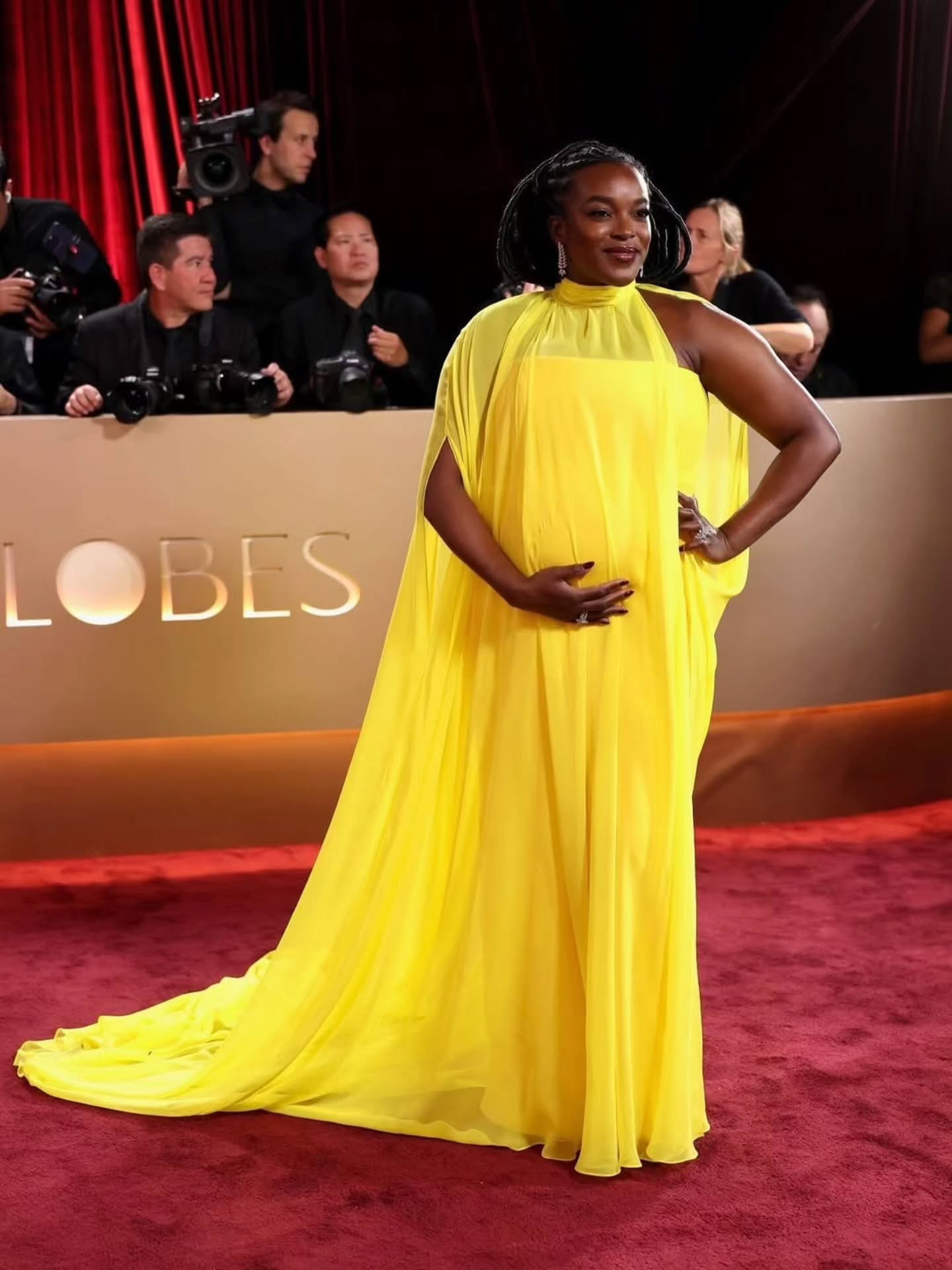 أما يونومي موساكو، فقد اختارت إطلالة مشرقة من توقيع Matthew Reisman، جاءت بفستان طويل باللون الأصفر الليموني الزاهي، عكس طاقة مفعمة بالحيوية والتفاؤل. وتميز التصميم بقصته الواسعة والمنسدلة مع ذيل طويل أضفى لمسة درامية أنيقة، فيما جاءت الرقبة عالية مع كاب منسدل على الكتفين منح الإطلالة طابعًا ملكيًا لافتًا، فبدت بإشراقة قوية وأناقة لا تخطئها العين.