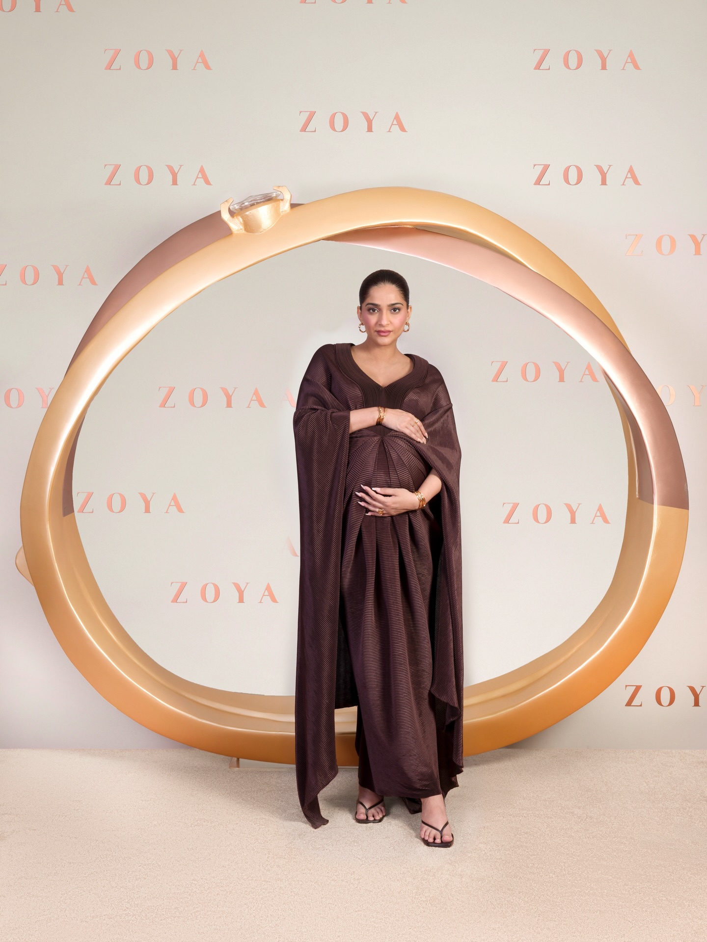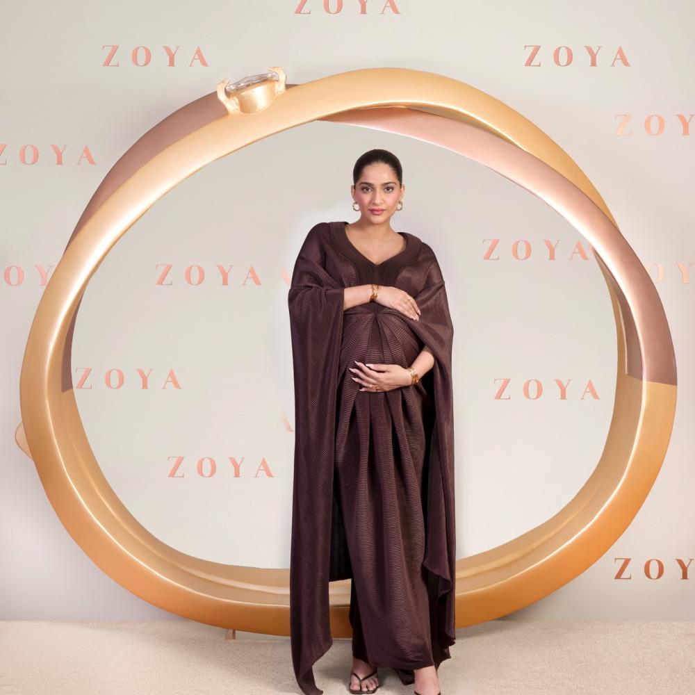 النجمة سونام كابور ظهرت بإطلالة استثنائية حملت توقيع المصمم أوميت أغاروال، وجسدت من خلالها مفهوم الأناقة الملكية المعاصرة. فقد اختارت فستان كاب طويلًا باللون البني الشوكولاتة، اعتمد بالكامل على قماش البليسيه ذي الثنيات الدقيقة التي منحت التصميم أبعادًا هندسية وانسيابية في الوقت نفسه.