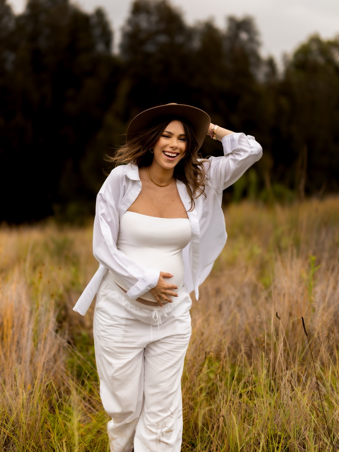 أما دانييلا رحمة، فاختارت خلال فترة حملها إطلالات عكست بساطة أنيقة وجرأة عصرية في الوقت نفسه. ففي إحدى جلسات التصوير التي سبقت ولادتها بفترة قصيرة، ظهرت بطقم أبيض مريح تألف من توب ضيق أبرز حملها بكل ثقة، مع قميص بوهيمي فضفاض تركته مفتوحًا ليمنح اللوك مزيدًا من الحرية والانسيابية. وأضافت القبعة الريفية التي اعتمدتها لمسة دافئة وكلاسيكية منحت الصور طابعًا ناعمًا ومميزًا.