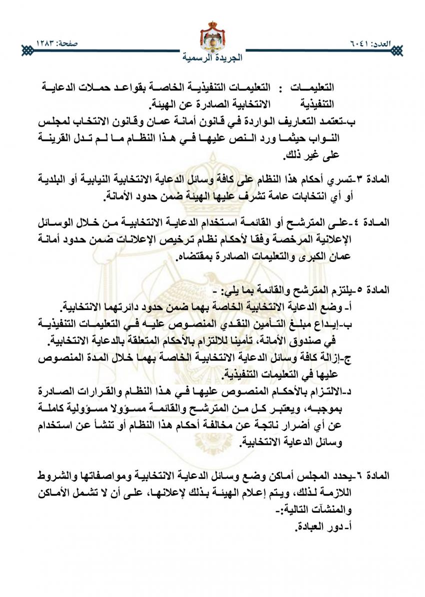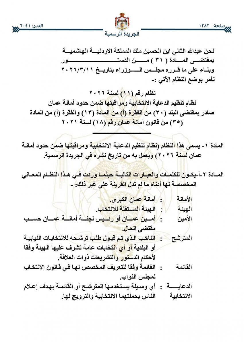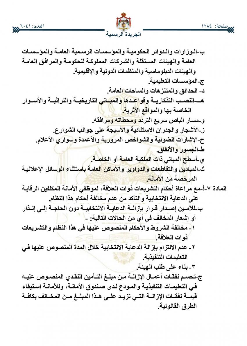 للعلّم - صدر في عدد الجريدة الرسمية اليوم الخميس، نظام تنظيم الدعاية الانتخابية ومراقبتها ضمن حدود أمانة عمان.