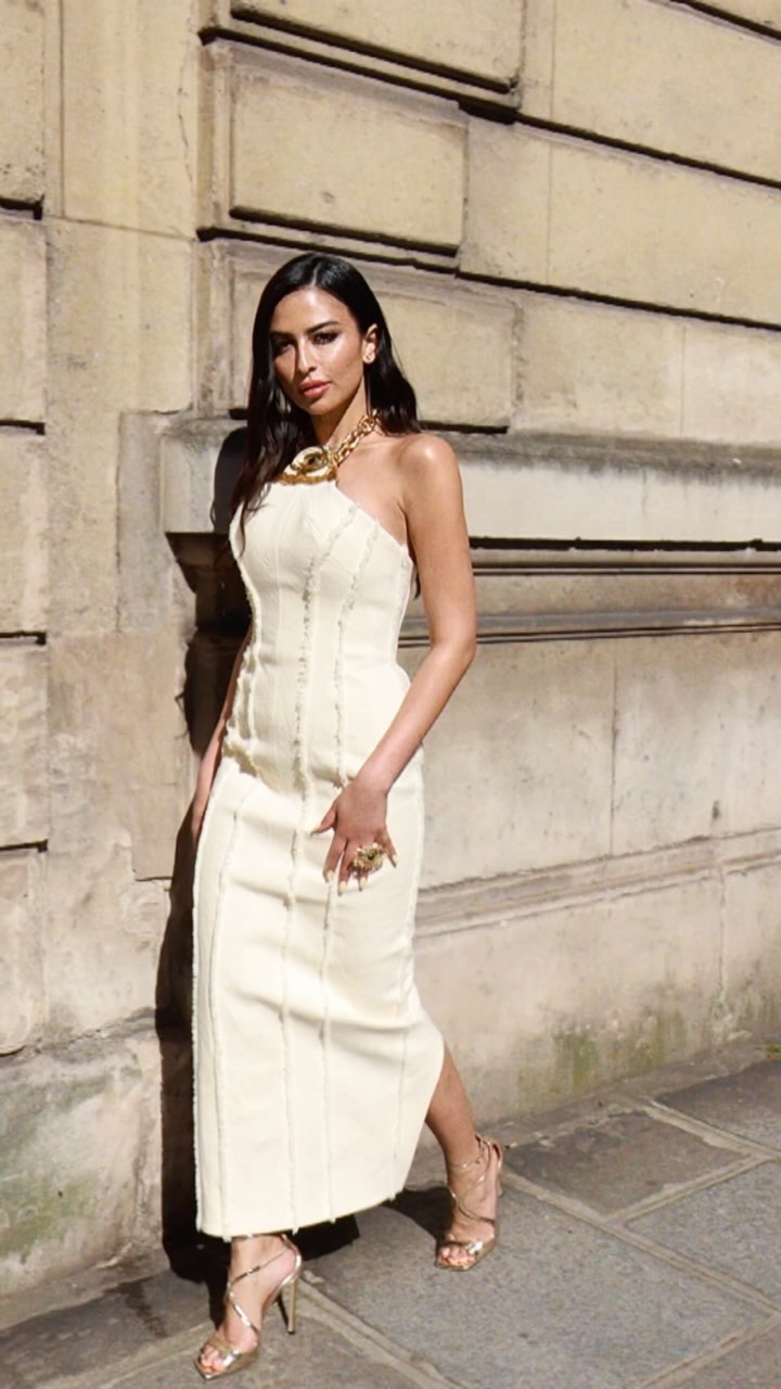 في مهرجان كان السينمائي 2025، تألقت بفستان أبيض ملائكي من دون حمالات من رامي قاضي، مصنوع من الكريب الساتان، مع طيات حريرية وشال خفيف ينساب بخفة على الرقبة، ضمن مجموعة الزفاف الجاهزة "Unveiled"، ليجمع بين العصرية والفخامة العربية الأنيقة.