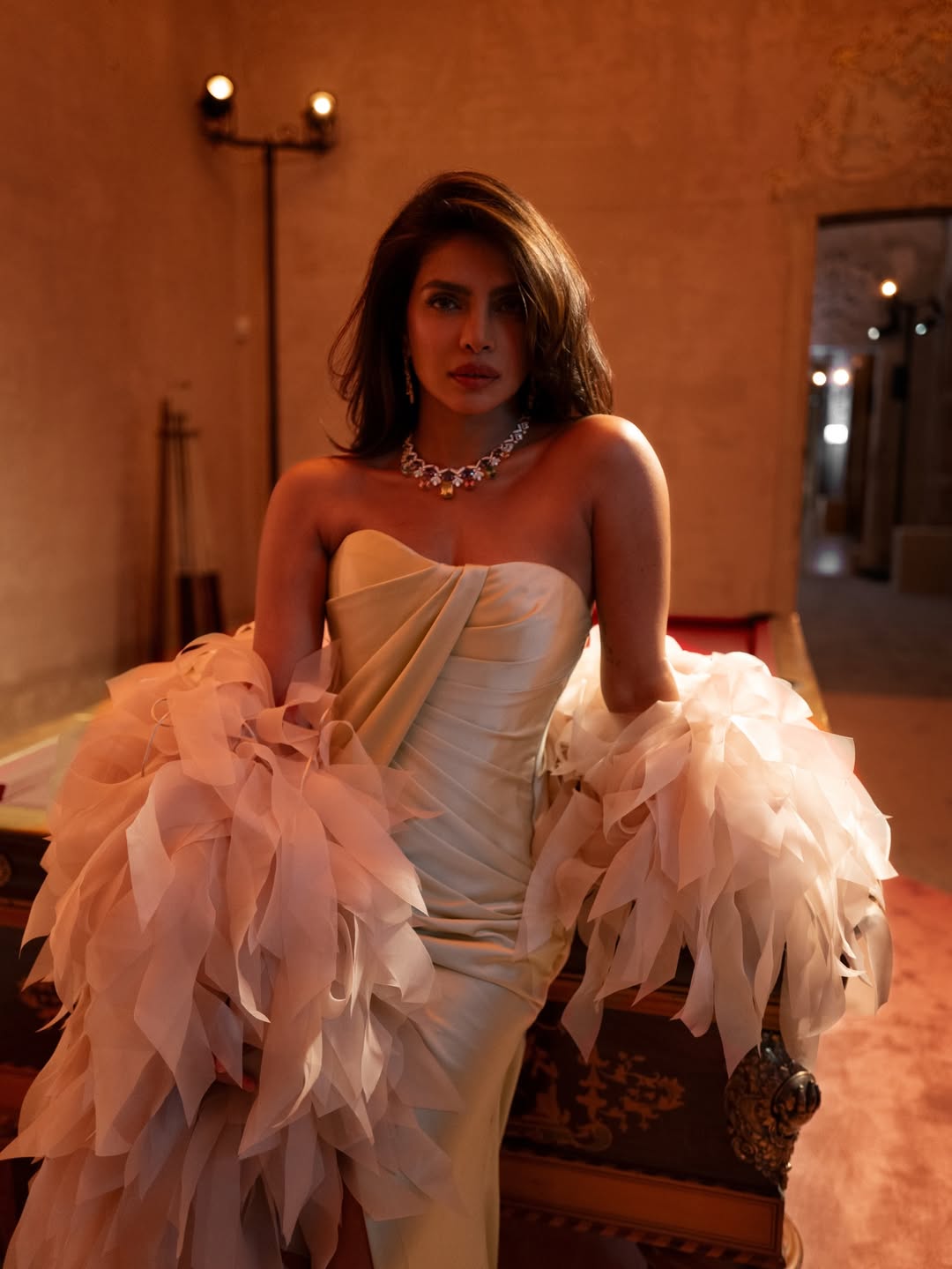 في ظهور سابق، اعتمدت بريانكا إطلالة من إيلي صعب، عبارة عن بوديسويت مرصع بالكريستال مع تنورة واسعة من الشيفون الشفاف باللون الكريمي، مع كاب مغطى ببتلات الورود يمتد على الكتفين والذراعين، لتجسّد الأنوثة الراقية والفخامة العصرية في آن واحد.
