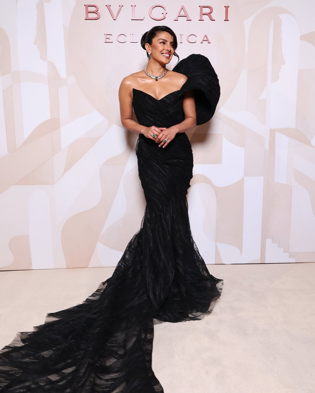 في الليلة الأولى لعرض تشكيلة Bvlgari، اختارت بريانكا فستاناً دراماتيكياً باللون الأسود من سعيد قبيسي، بقصة مجسمة ملتفة حول القوام وثنيات انسيابية على شكل حورية البحر، مع ذيل طويل وأكتاف مكشوفة. الكتف المنسدل والتفاصيل المنتفخة أضافت بعداً مسرحياً، فيما أكملت النجمة طلّتها بعقد وأقراط وخواتم مرصعة من دار Bvlgari، مع تسريحة كعكة أنيقة.