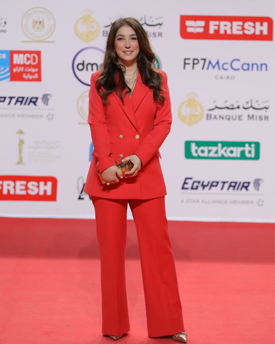 اختارت كندة بدلة حمراء Double Breasted بقصّة فضفاضة وأزرار ذهبية، تمنحها الأناقة والراحة.