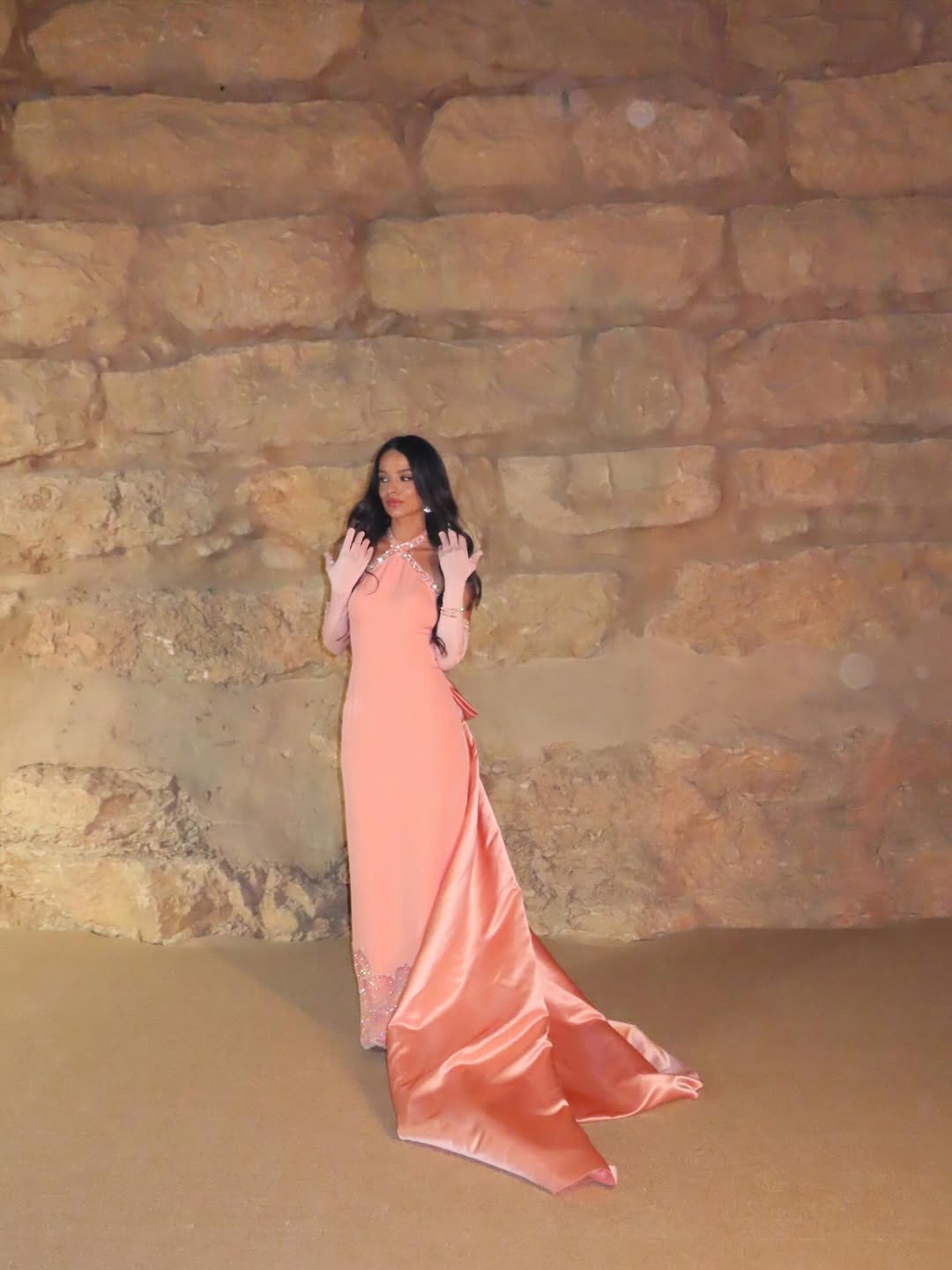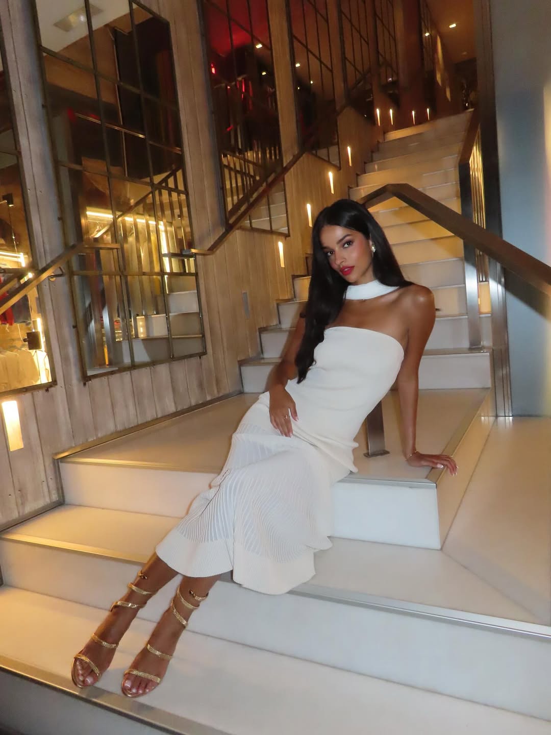 في حفل خطوبتها، ظهرت بفستان سترابلس حريري باللون الزهري من ماركة Ikh، مزين ورود الكشكش على الصدر وتطريزات خفيفة من الخرز الفضي، مع وشاح طويل يضفي لمسة دراماتيكية، وشعر مموج وتاج مرصع. بعد الخطوبة، اختارت فستان دانتيل كلاسيكي قصير بخصر محدد، مزين بترتر رقيق وفيونكة مخملية سوداء، مع رفع شعرها نصف رفعة وارتداء معطف فرو أسود أحيانًا.